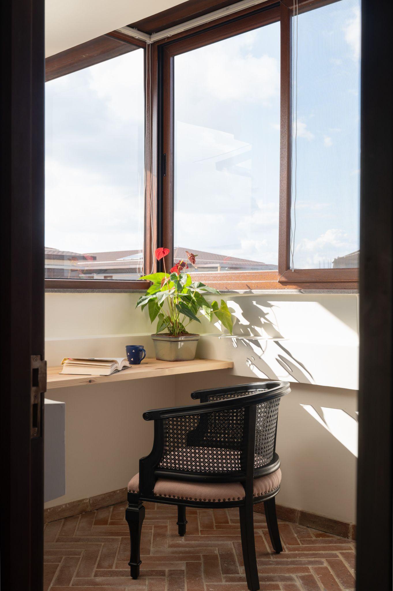 Không gian đọc nhỏ gọn với ghế mây đen, mặt bàn gỗ và chậu cây dưới ánh sáng tự nhiên tràn qua cửa kính lớn. Thiết kế tối giản nhưng đủ tiện nghi để tạo một góc thư giãn riêng tư, đón nắng nhẹ mỗi ngày