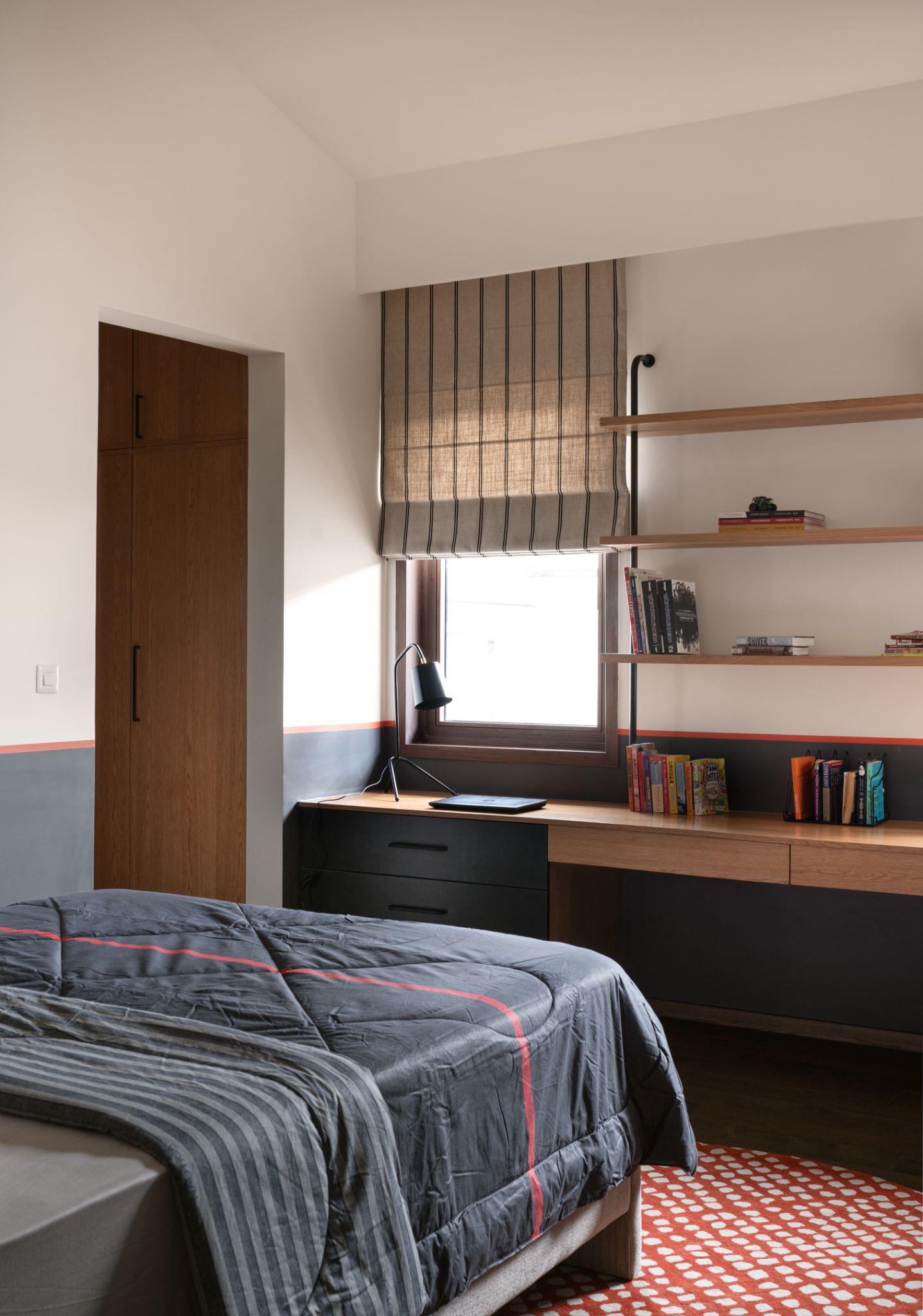 Phòng ngủ con có bàn học tích hợp kệ gỗ, rèm roman sọc và tủ đứng gỗ tự nhiên. Việc phối màu trung tính kết hợp điểm nhấn cam - đen giúp không gian trẻ trung nhưng vẫn gọn gàng, dễ tập trung học tập