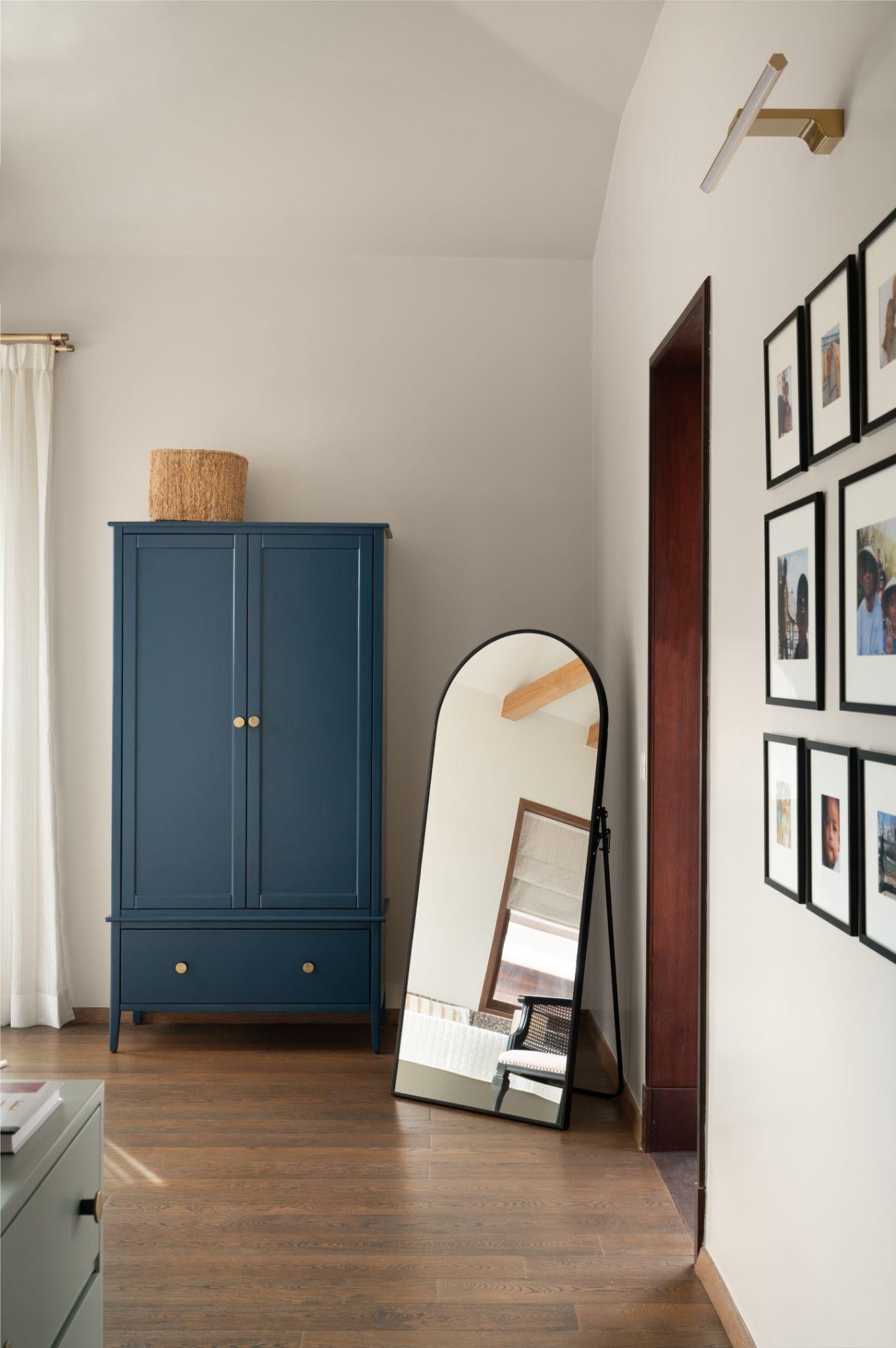 Góc phòng với tủ đứng xanh navy, gương lớn dáng vòm và dãy khung ảnh treo tường. Thiết kế dùng màu tối làm điểm nhấn trên nền tường sáng để tạo chiều sâu, đồng thời giữ tổng thể hài hòa và hiện đại