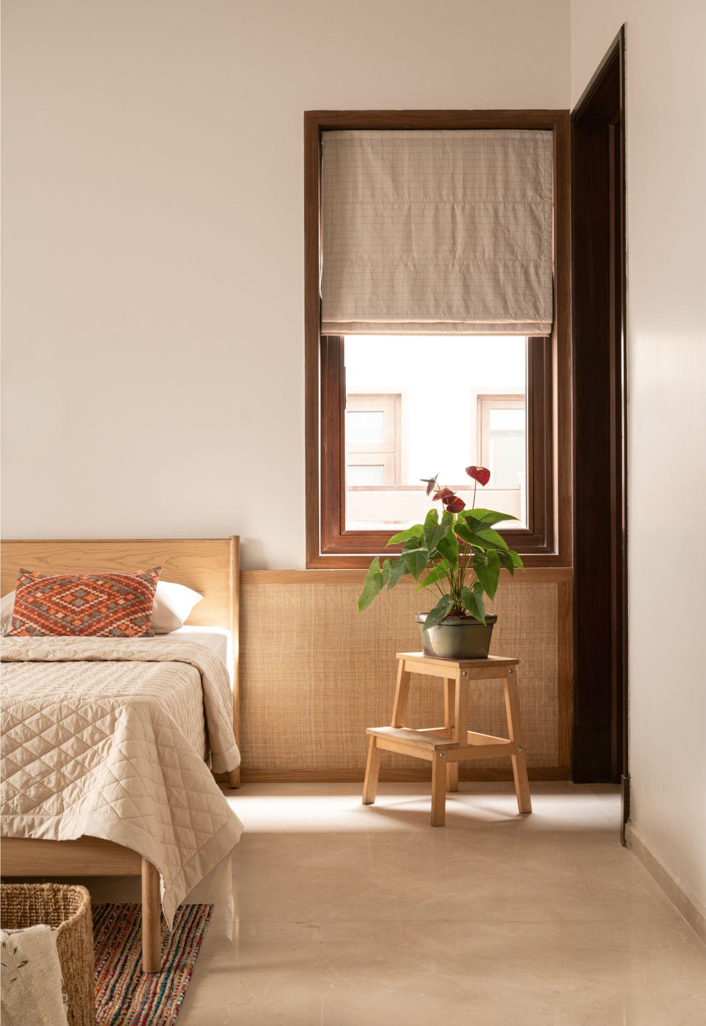 Phòng ngủ phụ có giường gỗ sáng màu, tường ốp mây và chậu cây nhỏ đặt trên ghế đôn tạo điểm nhấn. Ánh sáng tự nhiên giúp căn phòng mang cảm giác tươi mới và tinh giản, phù hợp phong cách gần gũi của cả ngôi nhà