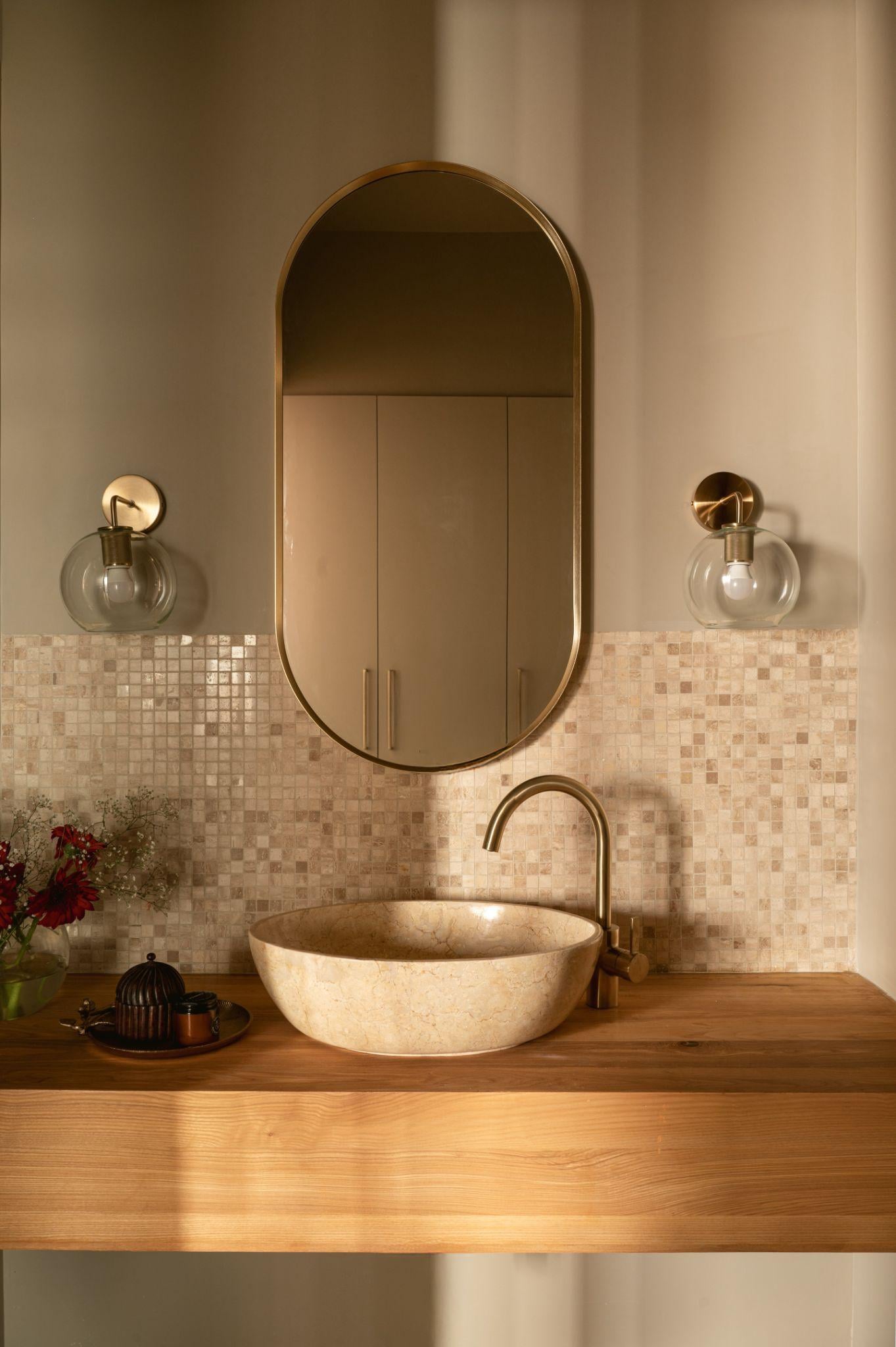 Góc lavabo với gương vòm, đèn tường thủy tinh và mặt bàn gỗ mộc kết hợp chậu đá tự nhiên. Bảng màu be - vàng nhạt tạo cảm giác ấm áp, trong khi mosaic nhỏ và kim loại gold làm tăng sự tinh tế