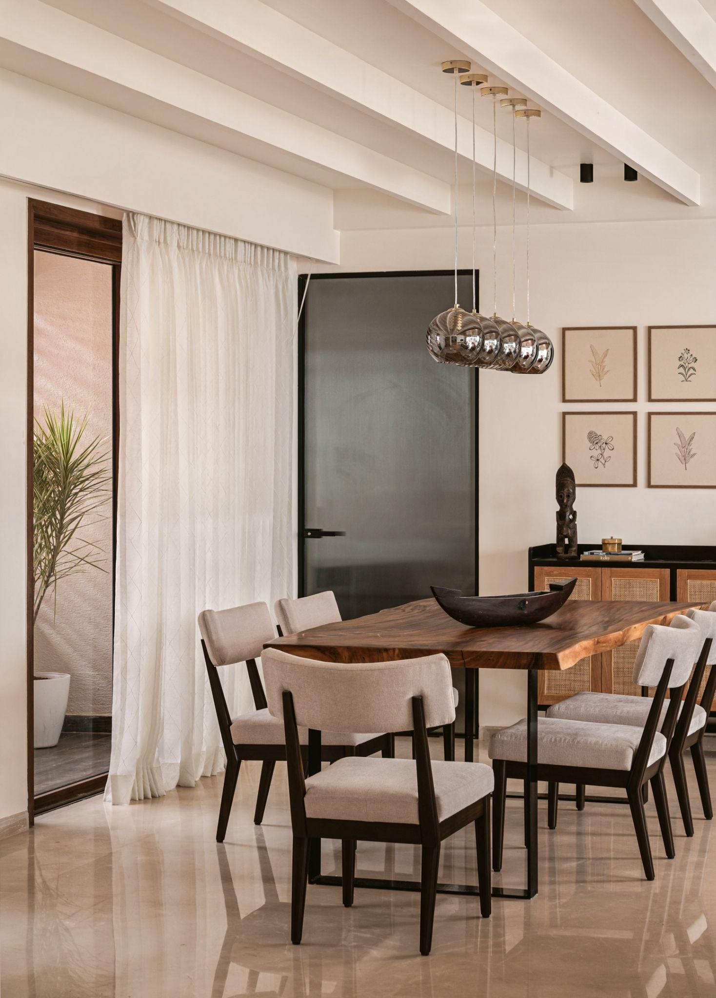 Phòng ăn mở rộng với trần xà trắng và rèm sáng mềm mại, tạo cảm giác thoáng và nhẹ. Tủ trang trí khung gỗ - mặt mây kết hợp tranh thực vật mang đến nét tự nhiên, thư thái cho căn phòng