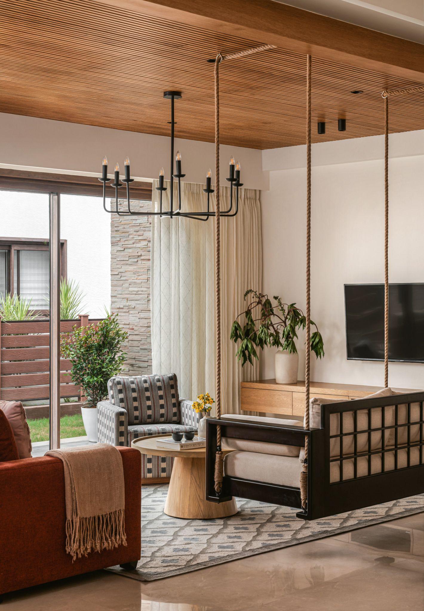 Không gian phòng khách mở với sofa màu đất nung, ghế họa tiết, bàn gỗ tròn và chiếc xích đu treo bằng dây thừng tạo điểm nhấn thư giãn. Thiết kế tận dụng trần gỗ, cửa kính lớn và sân vườn liền kề để mang lại cảm giác thoáng sáng kiểu California nhưng vẫn giữ sự ấm áp bản địa