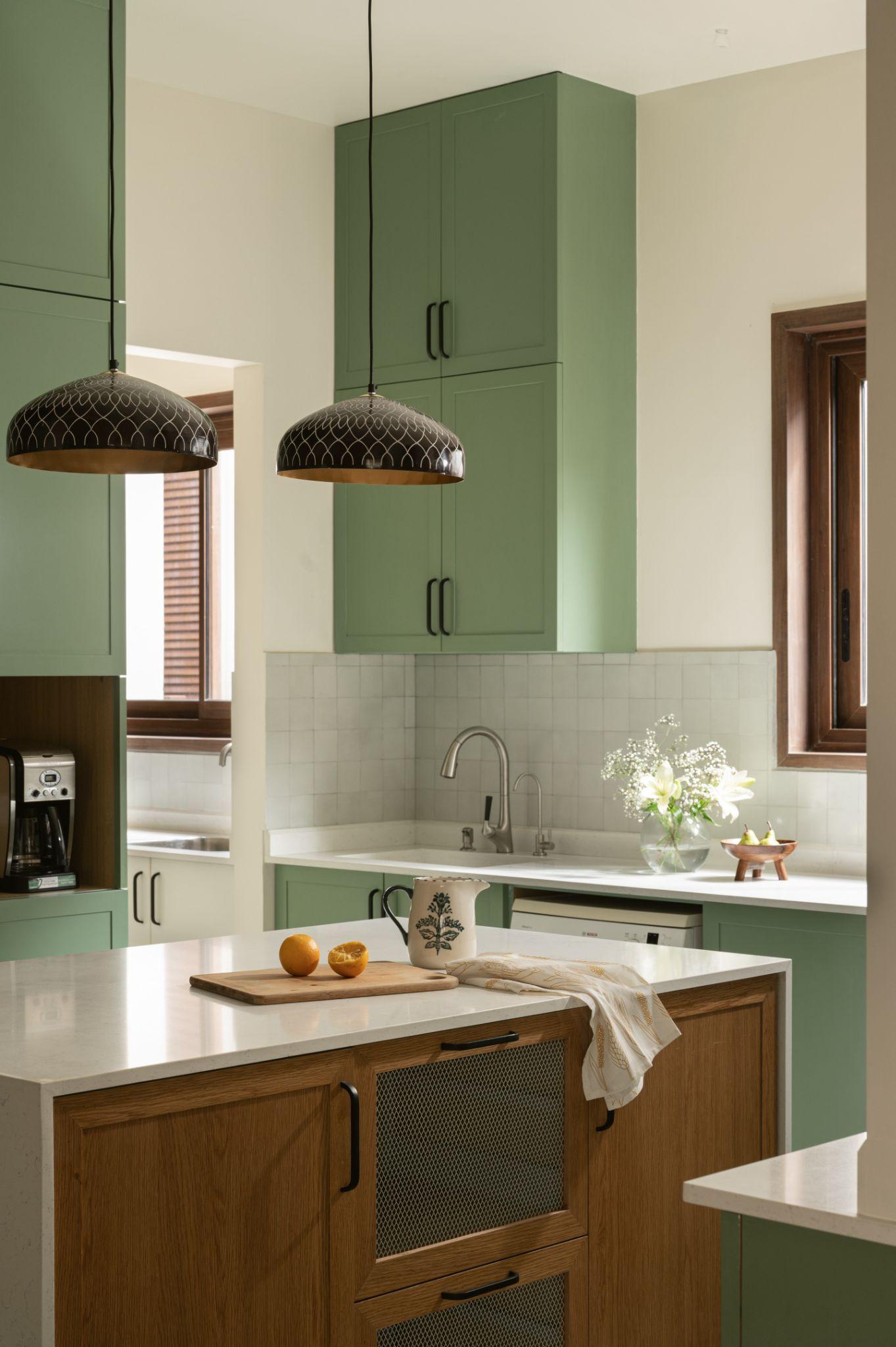 Góc nhìn vào đảo bếp với hệ tủ gỗ kết hợp nan sắt và tủ cao xanh sage, tạo sự cân bằng giữa tự nhiên và hiện đại. Đèn thả đôi màu đen trở thành tâm điểm thị giác, giúp bếp có thêm chiều sâu