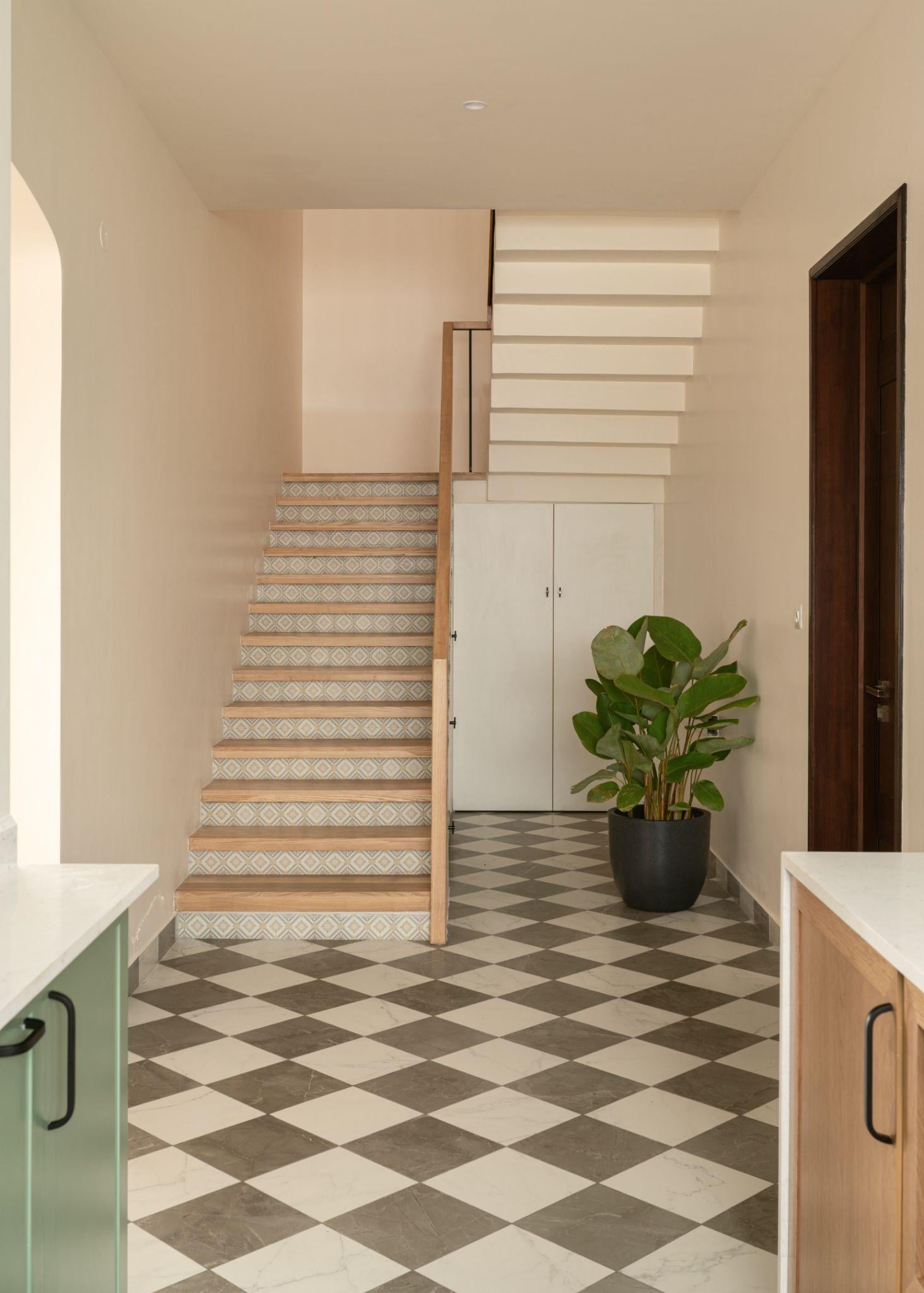 Lối vào cầu thang rộng rãi với nền gạch caro trắng - xám và bậc thang ốp họa tiết. Thiết kế sử dụng mảng xanh đặt cạnh giúp làm mềm không gian và tạo cảm giác dễ chịu khi di chuyển giữa các tầng