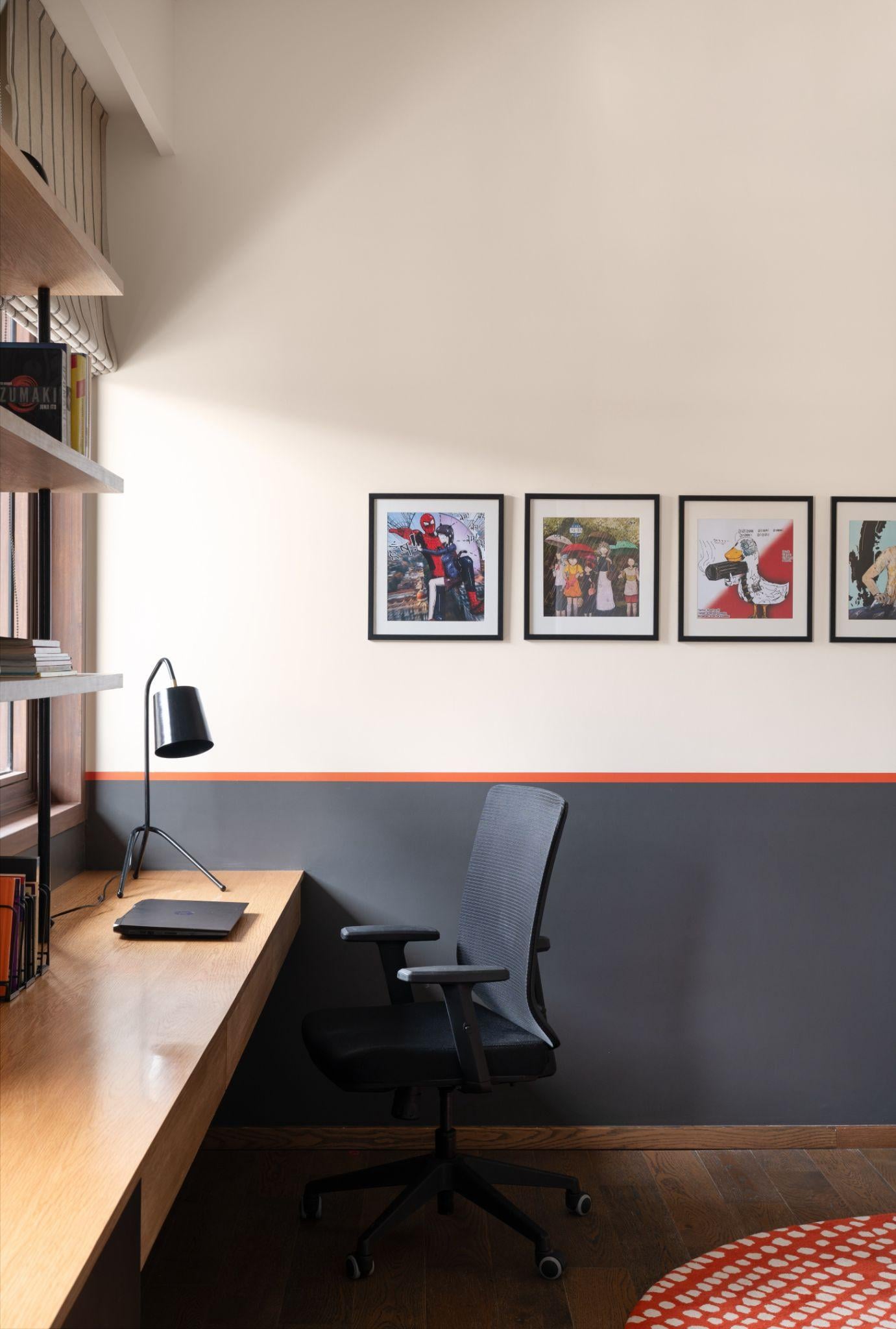Không gian bàn học tối giản với mặt bàn gỗ dài, ghế công thái học và loạt tranh khung đen treo ngang tạo điểm nhấn vui tươi. Cách phối tường hai màu xám - kem cùng đường line cam giúp không gian trẻ trung, tập trung nhưng vẫn có cá tính