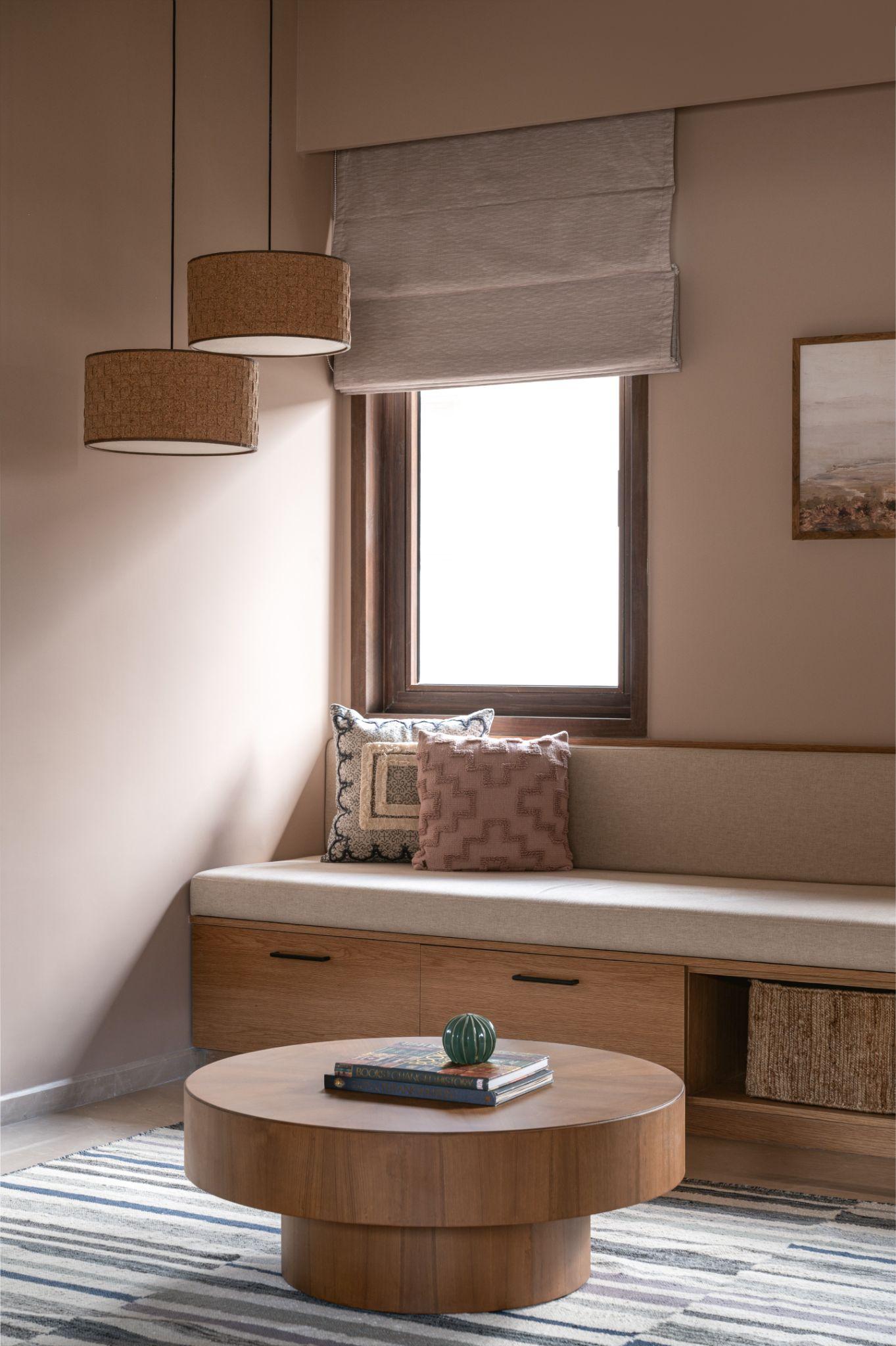 Góc sinh hoạt gia đình với bench gỗ dài, đệm màu be và bàn trà tròn đặt trên thảm sọc xanh. Thiết kế ưu tiên sự thoải mái và bảng màu nhẹ, tạo nơi nghỉ ngơi yên bình trong tổng thể ngôi nhà
