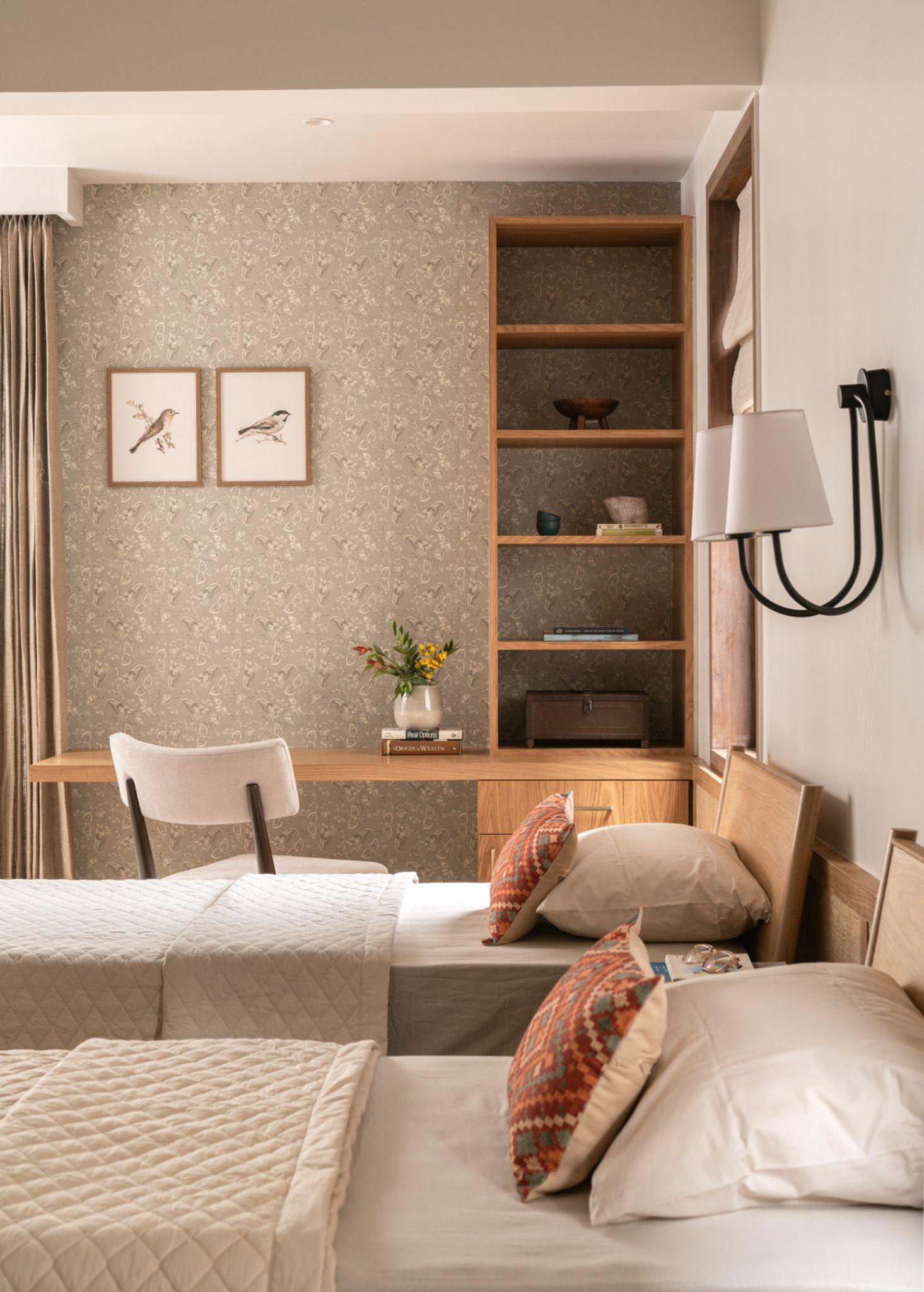 Căn phòng dùng hai giường đơn gỗ sáng màu, kết hợp thảm dệt nhiều màu và gối họa tiết đỏ cam. Thiết kế nhẹ nhàng, ấm áp nhờ vật liệu tự nhiên và tông trung tính, tạo cảm giác thoải mái cho không gian nghỉ ngơi