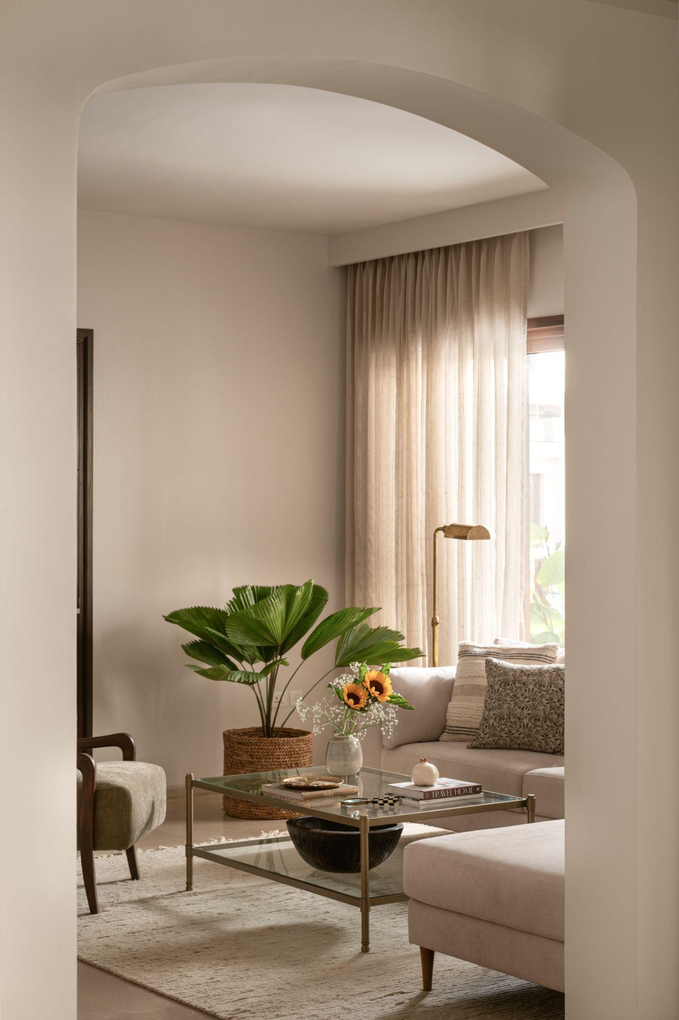 Phòng khách formal hiện lên qua khung vòm với sofa be lớn, bàn kính và chậu cây lá to. Việc dùng rèm voan, ánh sáng mềm và tông trung tính giúp phòng nhẹ nhàng, sang mà không cầu kỳ