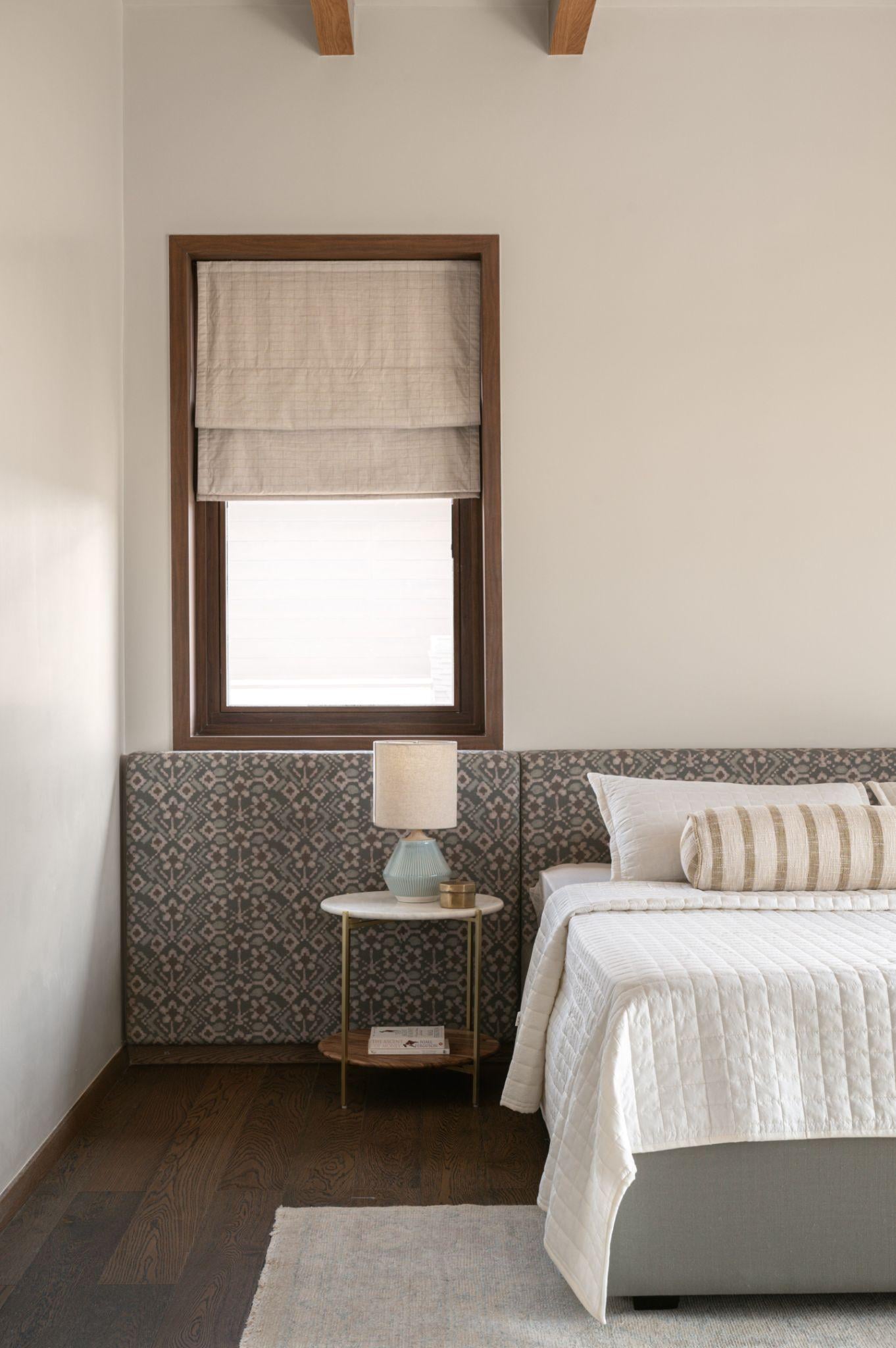 Không gian đầu giường sử dụng tấm ốp họa tiết geometric màu trầm, kết hợp rèm roman sáng và đèn bàn gốm xanh. Cách phối họa tiết - chất liệu nhằm tạo chiều sâu thị giác nhưng vẫn duy trì cảm giác ấm và nhẹ nhàng cho phòng nghỉ