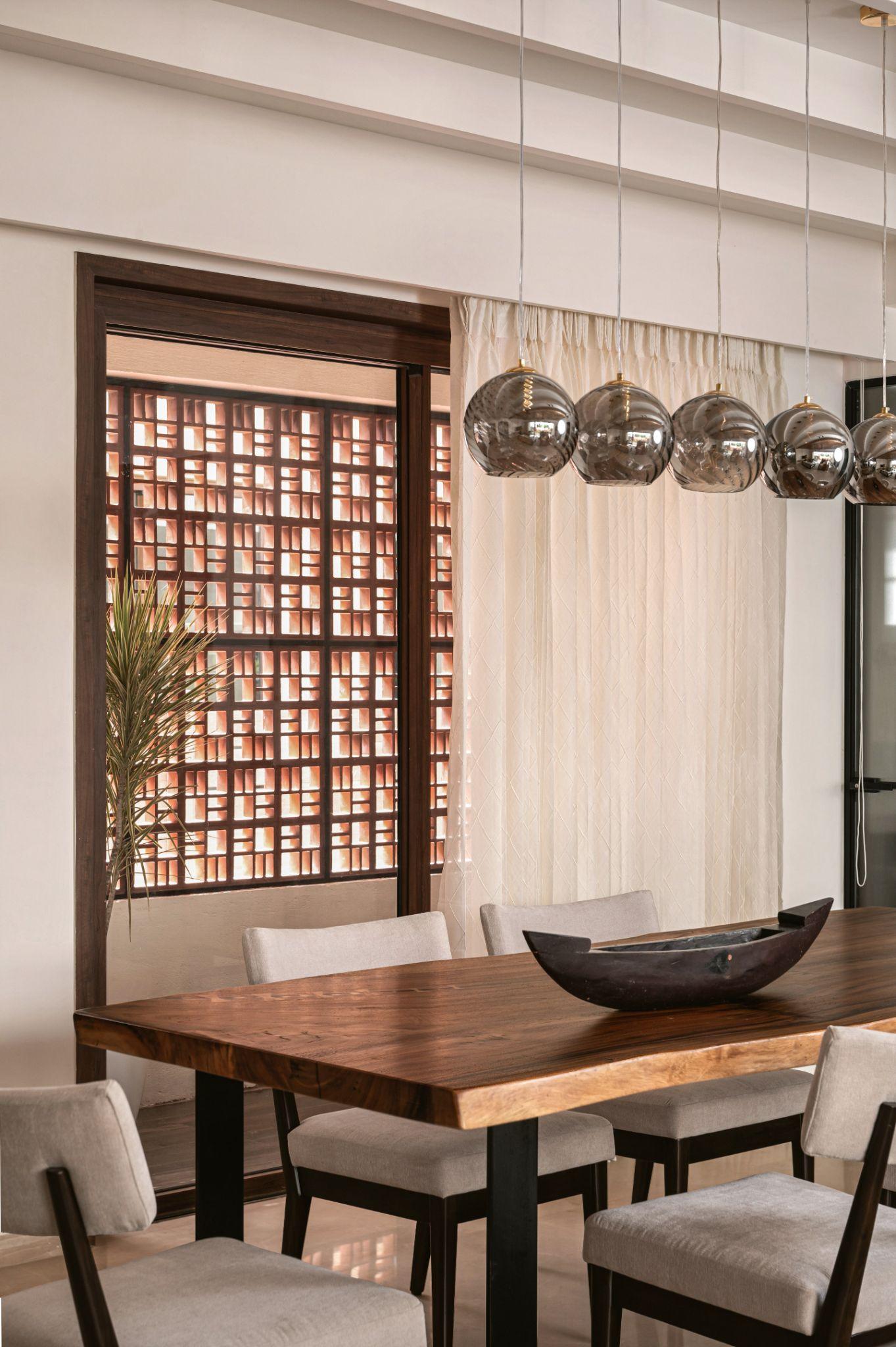 Ánh sáng lọc qua mảng gạch thông gió tạo nên những vệt sáng ấm áp ngay bên bàn ăn gỗ tự nhiên. Bộ đèn thả thủy tinh màu khói giúp không gian thêm hiện đại và có chiều sâu
