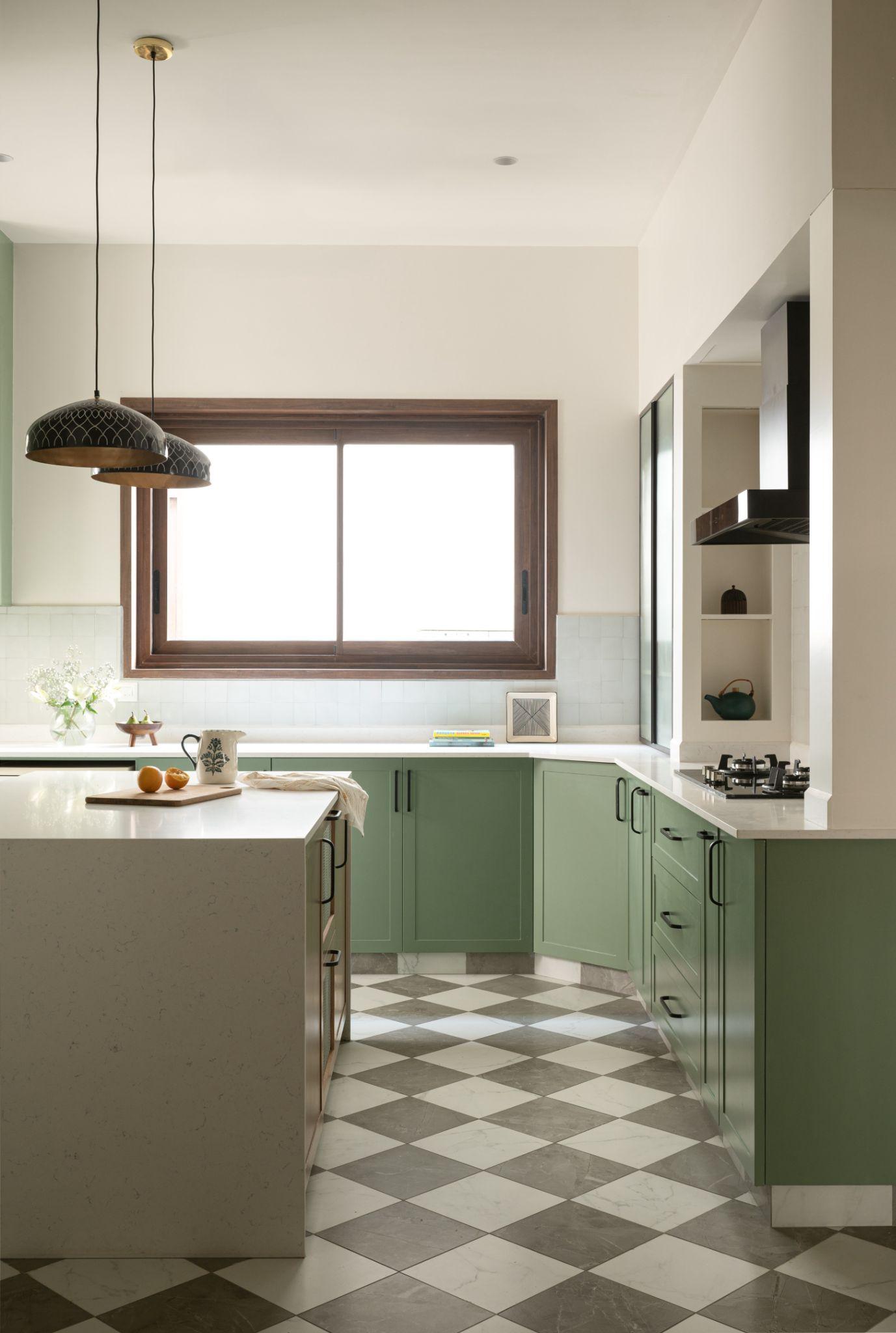 Không gian bếp chữ U nổi bật với tủ dưới màu xanh sage, mặt bàn trắng và hệ đèn thả trần tinh tế. Việc bố trí cửa sổ lớn và gam màu sáng giúp bếp luôn thoáng, đồng thời tạo cảm giác hiện đại nhưng vẫn ấm áp