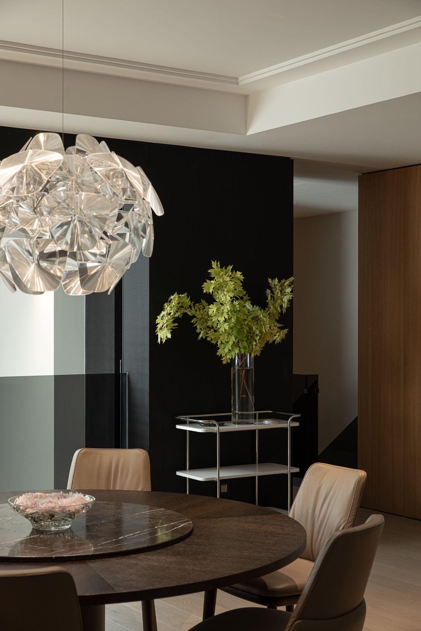 Bàn ăn tròn đặt giữa phòng với điểm nhấn là bình lá xanh mướt nổi bật trên nền tường đen. Cách phối vật liệu trầm - sáng tạo cảm giác ấm cúng nhưng vẫn hiện đại