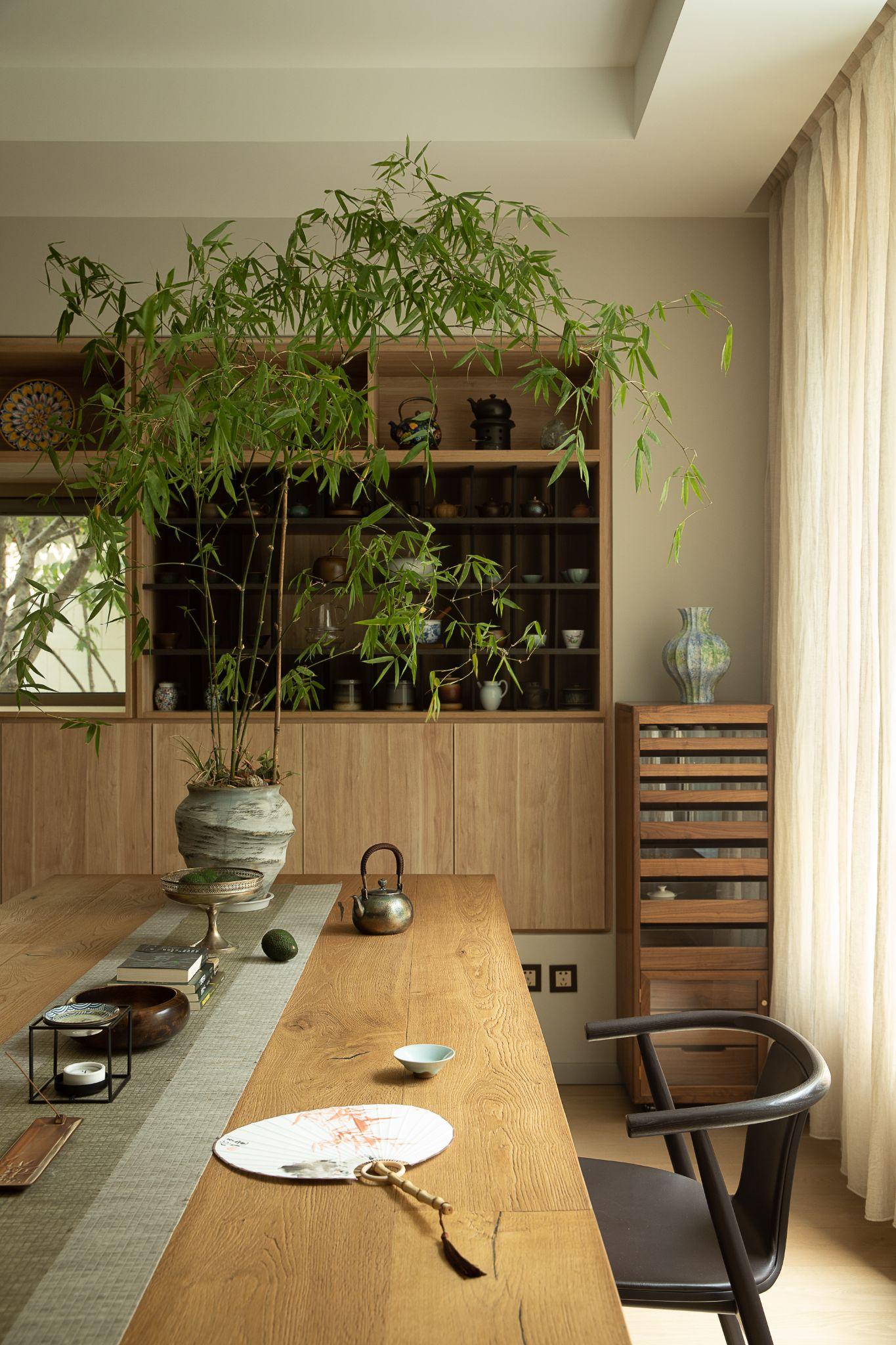 Cận cảnh bàn trà với bình trúc, quạt giấy và đồ gốm mang tinh thần Á Đông. Đường vân gỗ lớn làm nổi bật vẻ mộc mạc của không gian