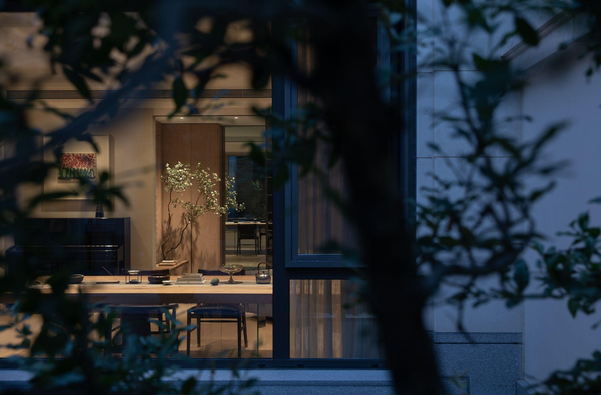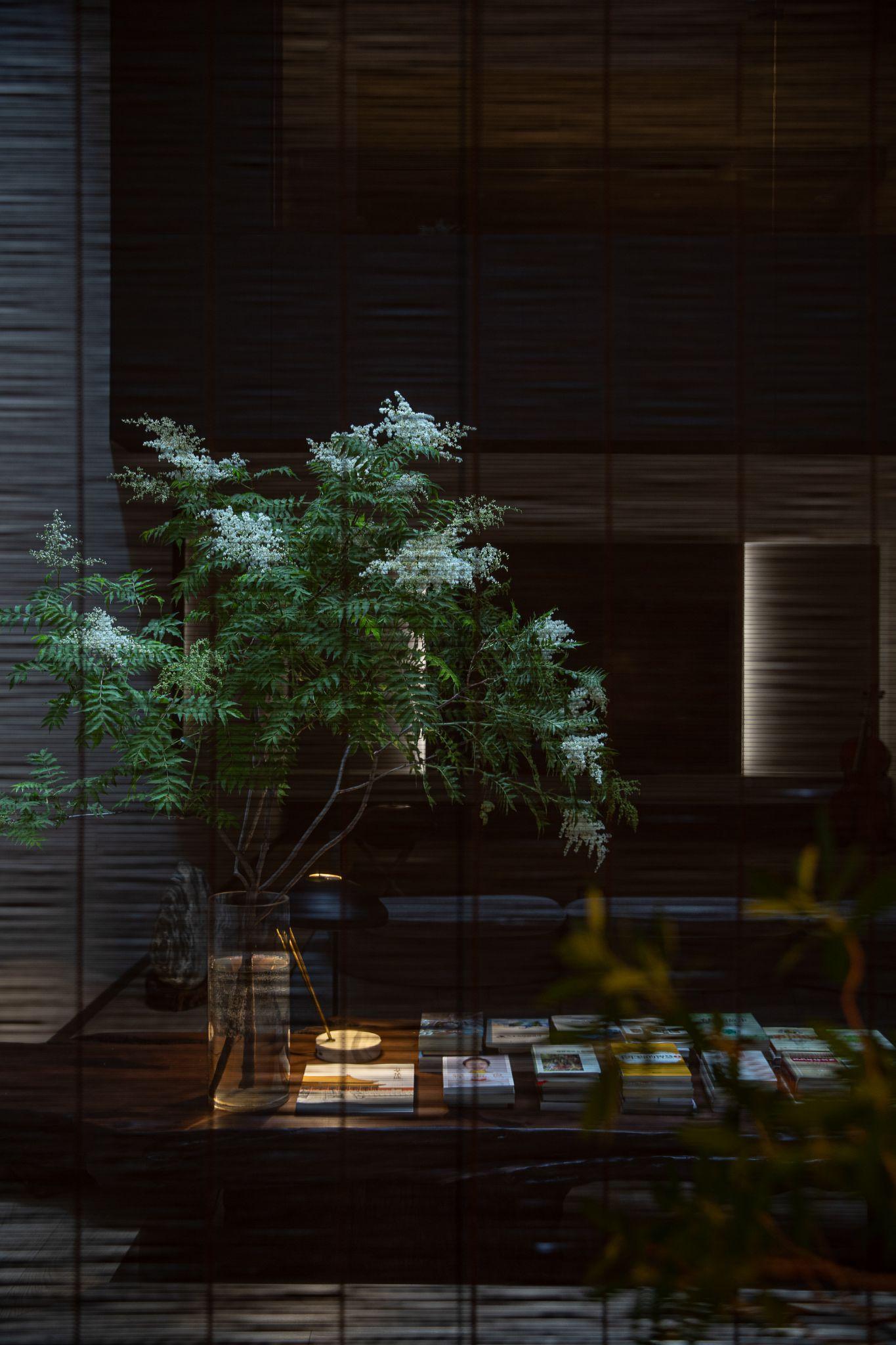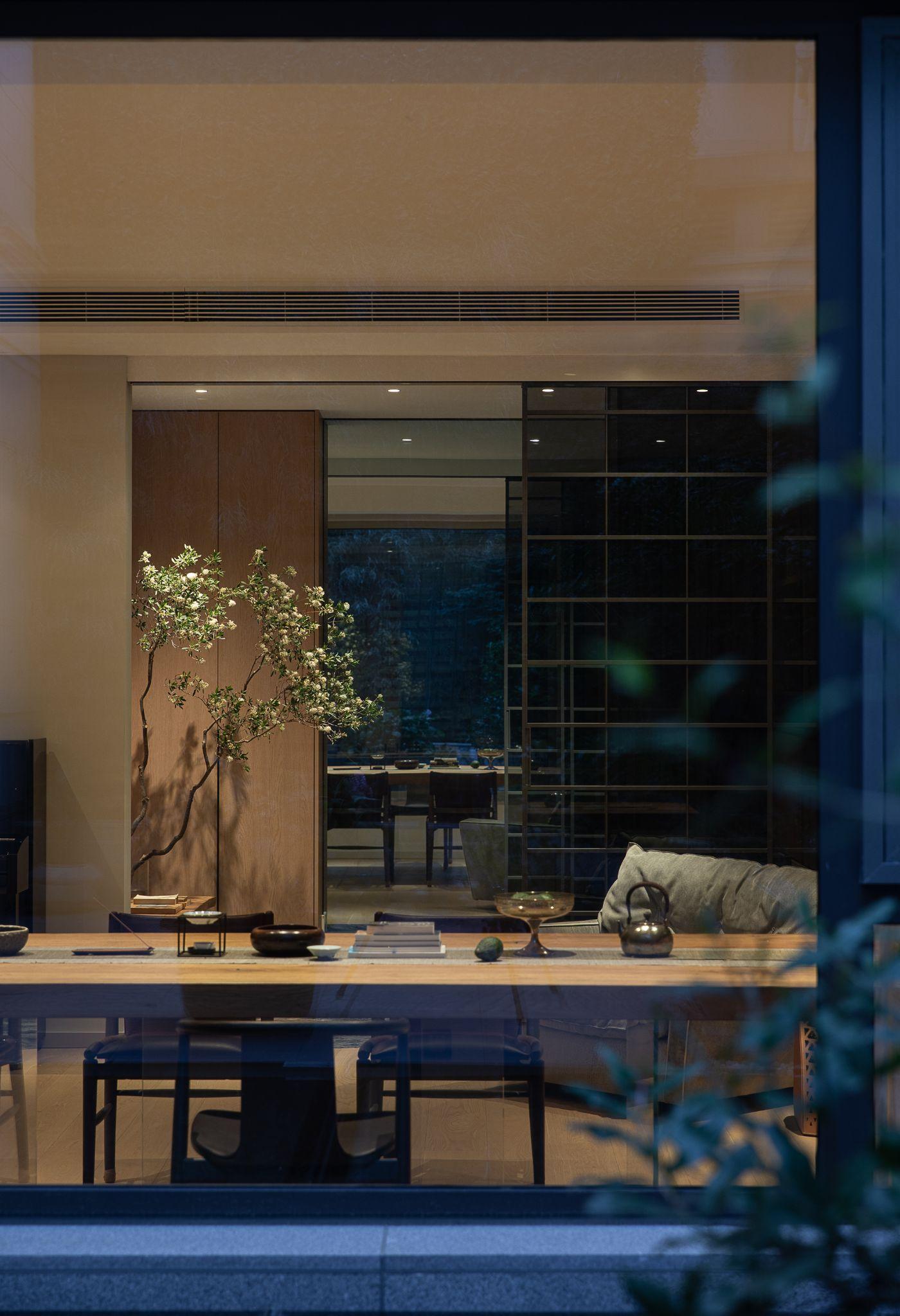 Ánh sáng xanh nhạt đầu tối lọt qua cửa kính, soi rõ bình hoa và bàn trà bên trong. Không gian giữ được vẻ trầm tĩnh đặc trưng của S House