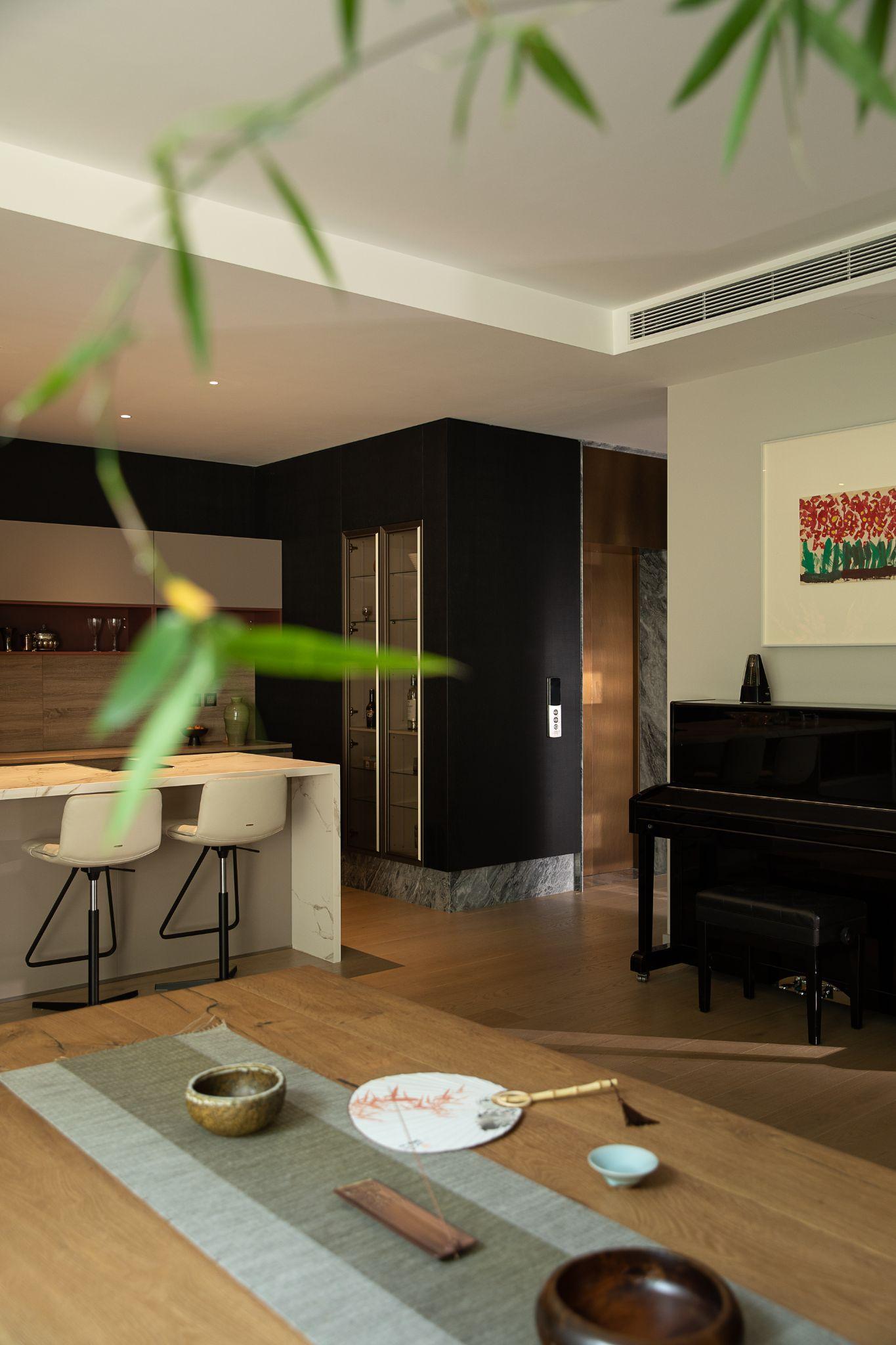 Góc nhìn từ bàn trà đạo hướng về khu bếp nhỏ, nơi hai ghế bar sáng màu tạo điểm nhấn nhẹ. Các vật dụng truyền thống như quạt giấy, lư trầm giúp không gian mang hơi hướng tĩnh lặng Á Đông