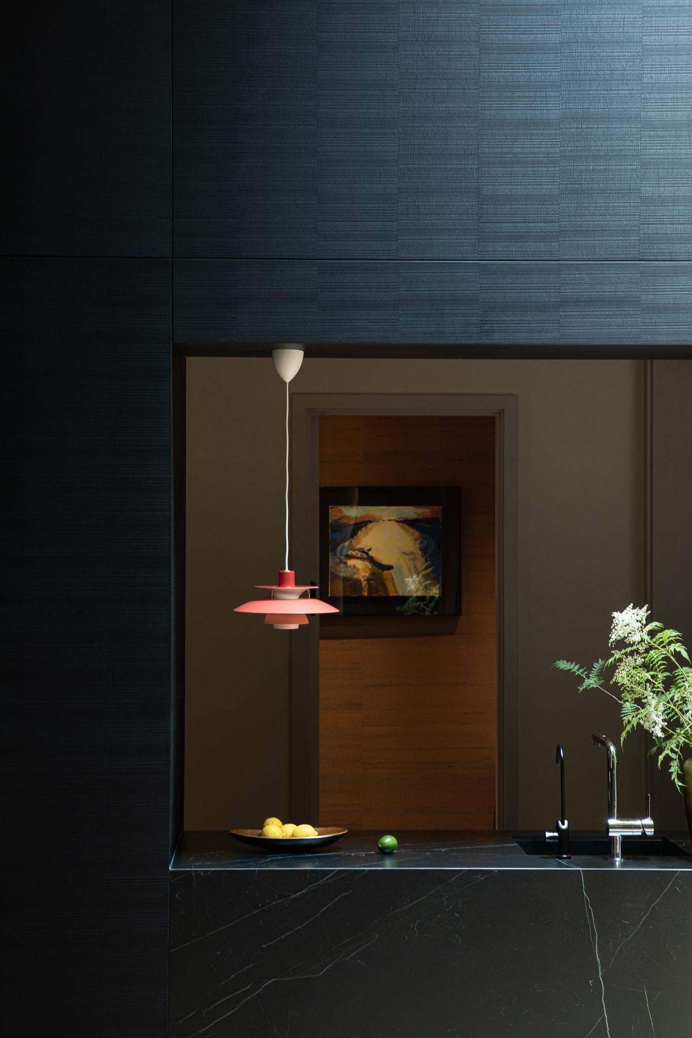 Đèn treo màu hồng nhạt tạo điểm nhấn mềm cho góc bếp tối giản. Mảng tường xám đậm bao quanh giúp ánh sáng và màu sắc trở nên rõ nét hơn