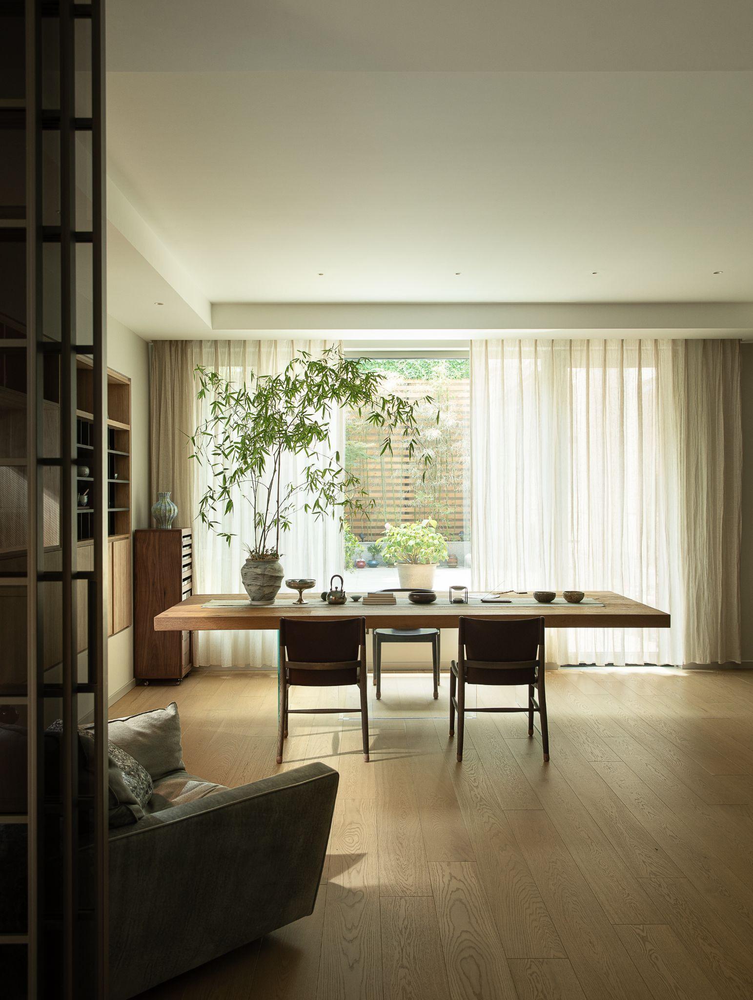 Không gian trà - đọc mở ra sân sau với ánh sáng dịu đi qua lớp rèm mỏng. Cây trúc lớn đặt trên bàn gợi cảm giác thiền tĩnh và kết nối tự nhiên