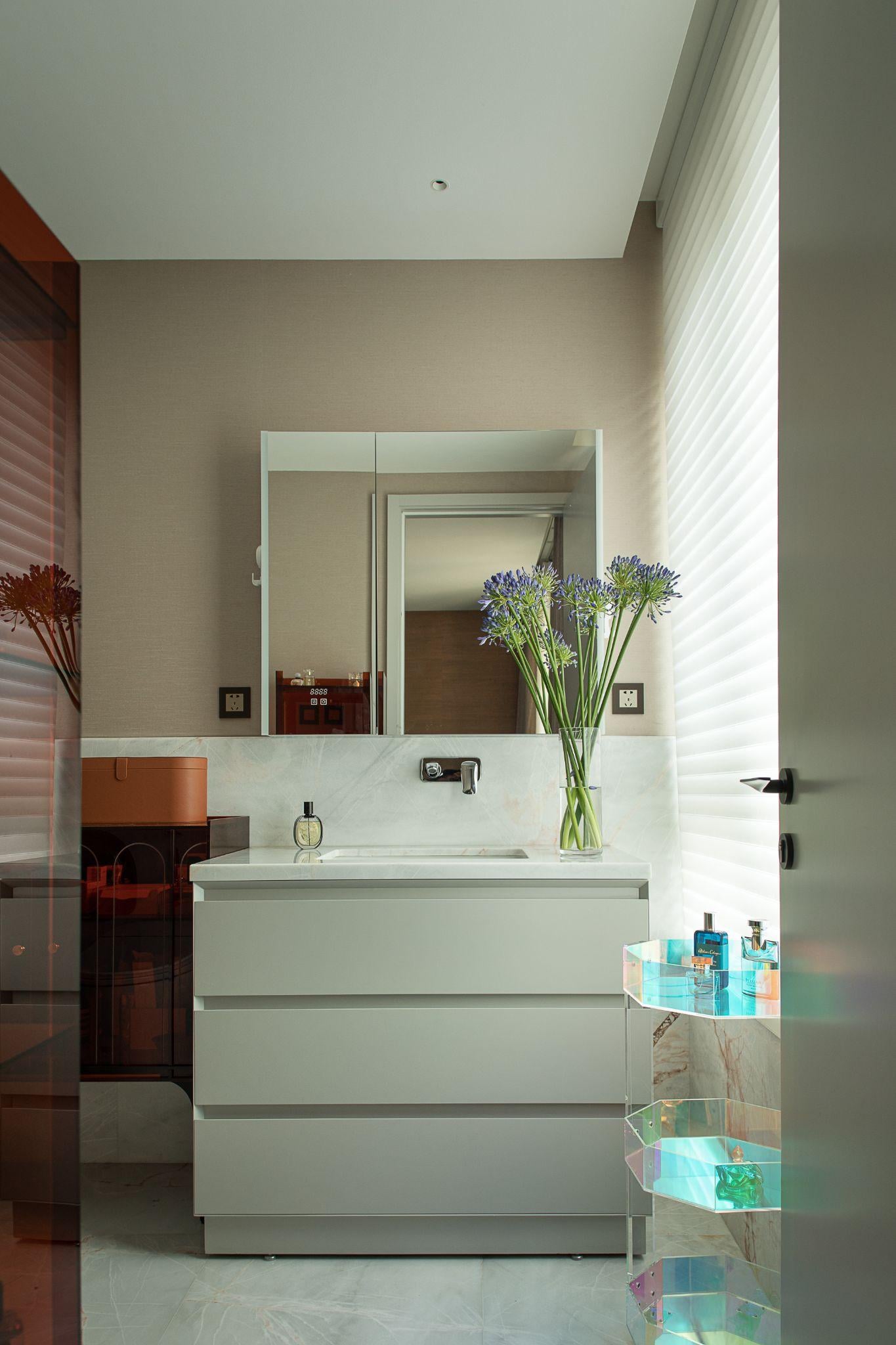 Phòng tắm đơn sắc với bồn rửa tối giản và ánh sáng dịu từ rèm. Bình hoa xanh tím tạo điểm nhấn thanh lịch