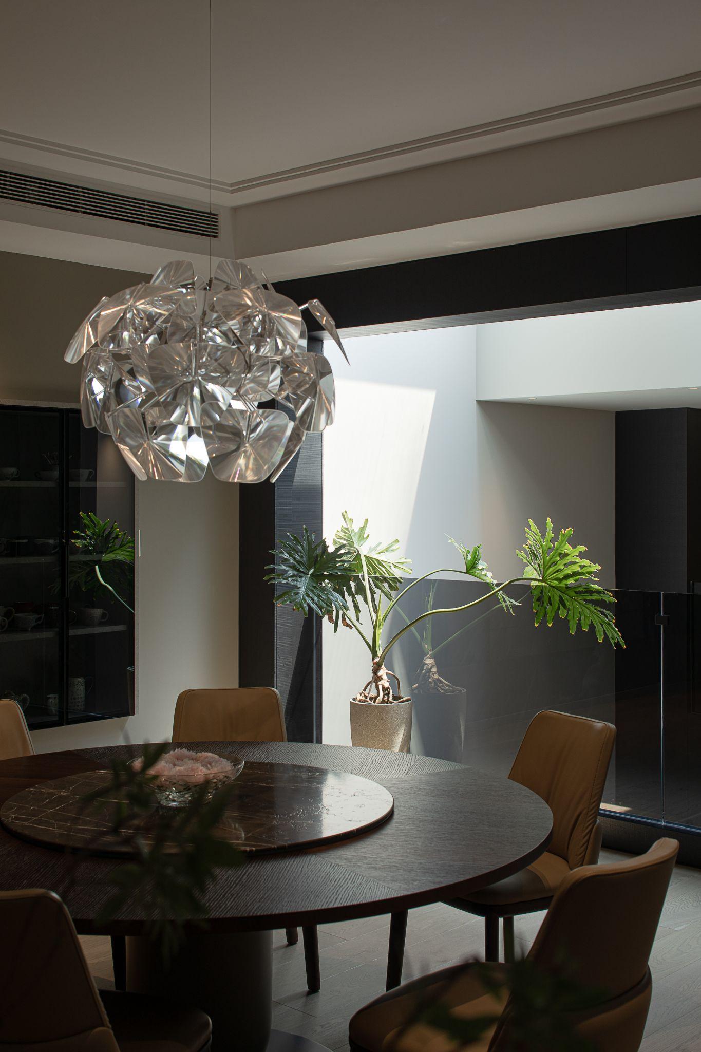 Ánh sáng từ giếng trời rọi xuống bàn ăn tròn, làm nổi bật chiếc đèn treo pha lê ánh kim. Cây trầu bà lớn đặt sát atrium giúp không gian ăn uống thêm thoáng đãng và kết nối với thiên nhiên