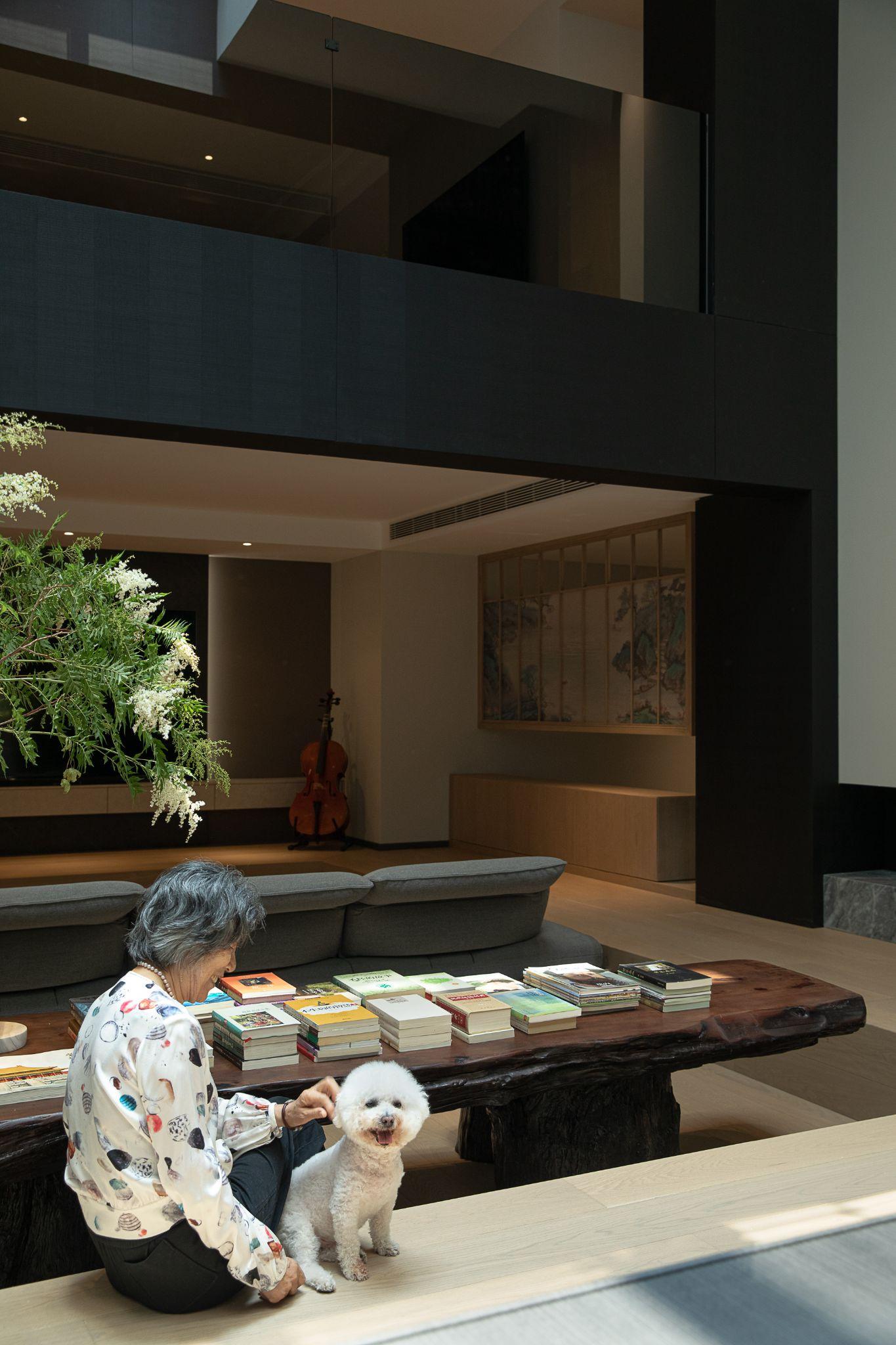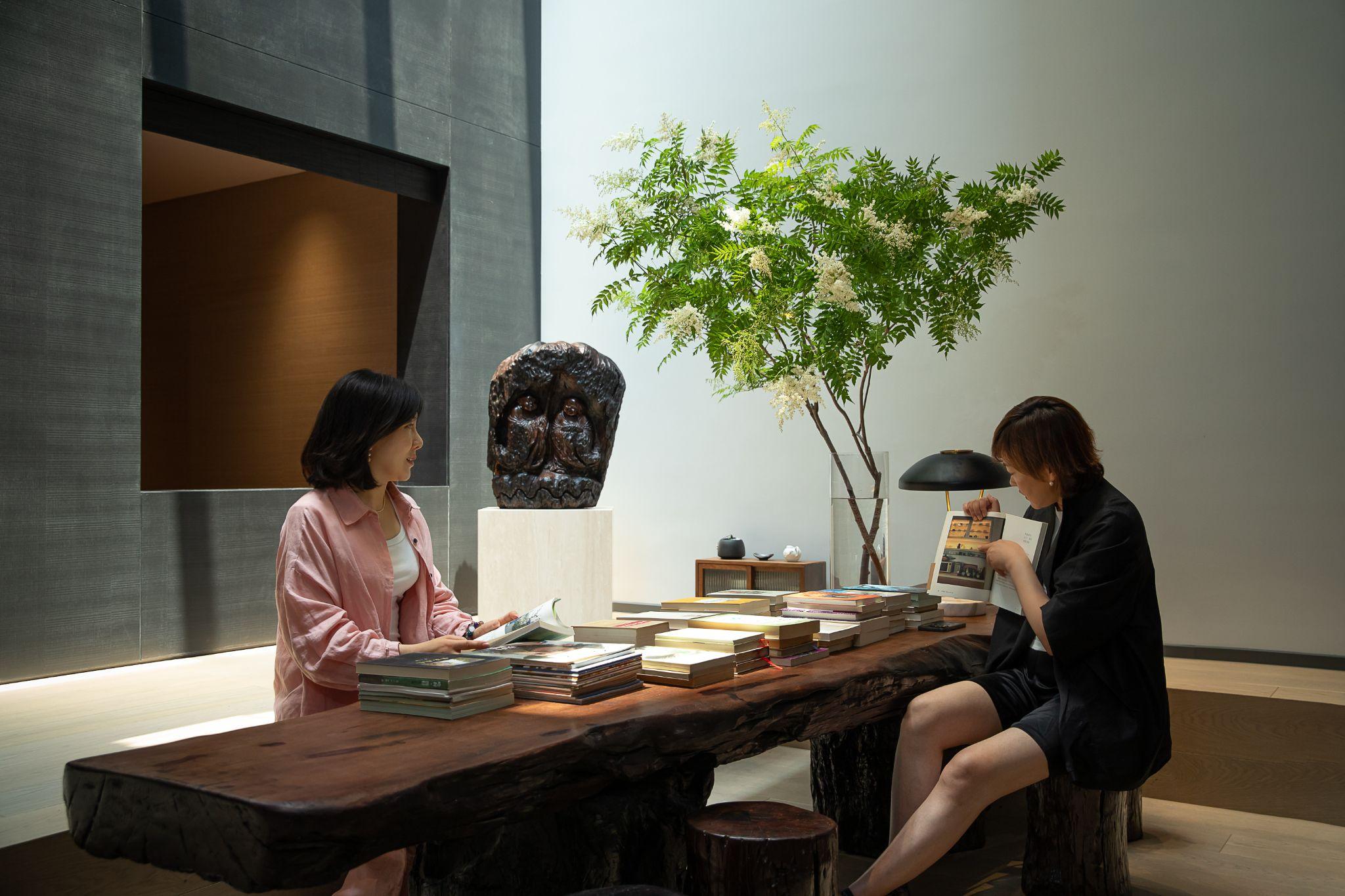 Bàn gỗ nguyên khối đặt giữa atrium trở thành nơi đọc sách và trò chuyện dưới ánh nắng tự nhiên. Cây xanh và điêu khắc đặt cạnh giúp không gian đời thường mang hơi hướng thiền tĩnh