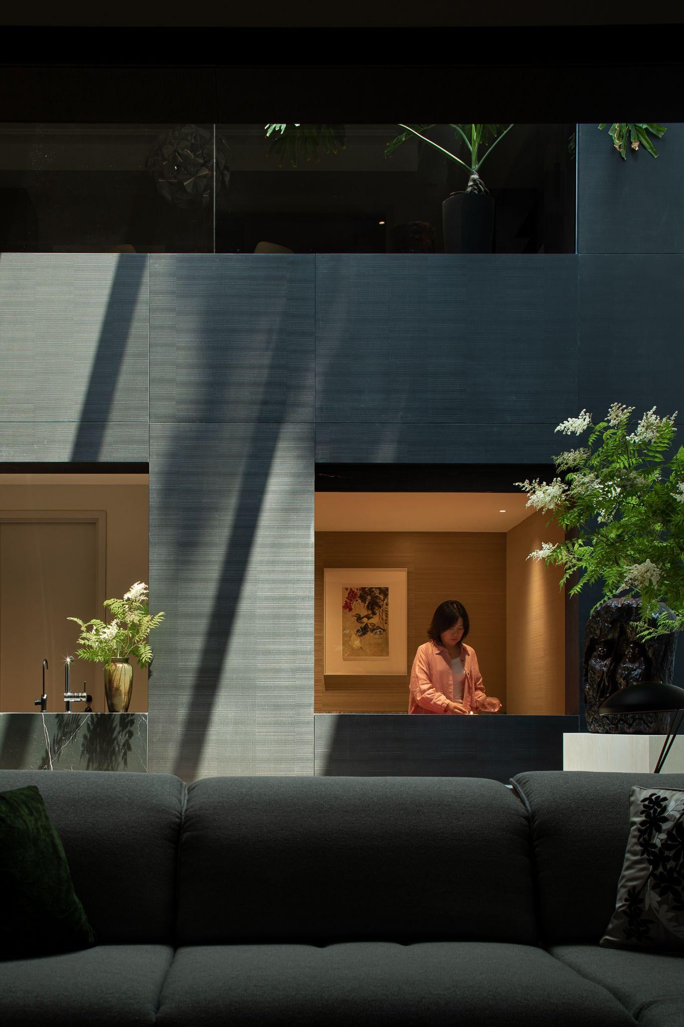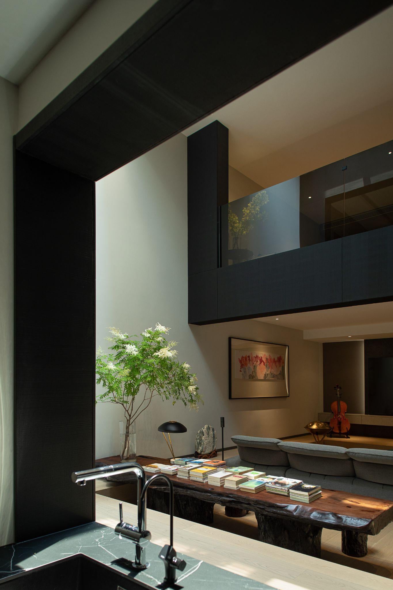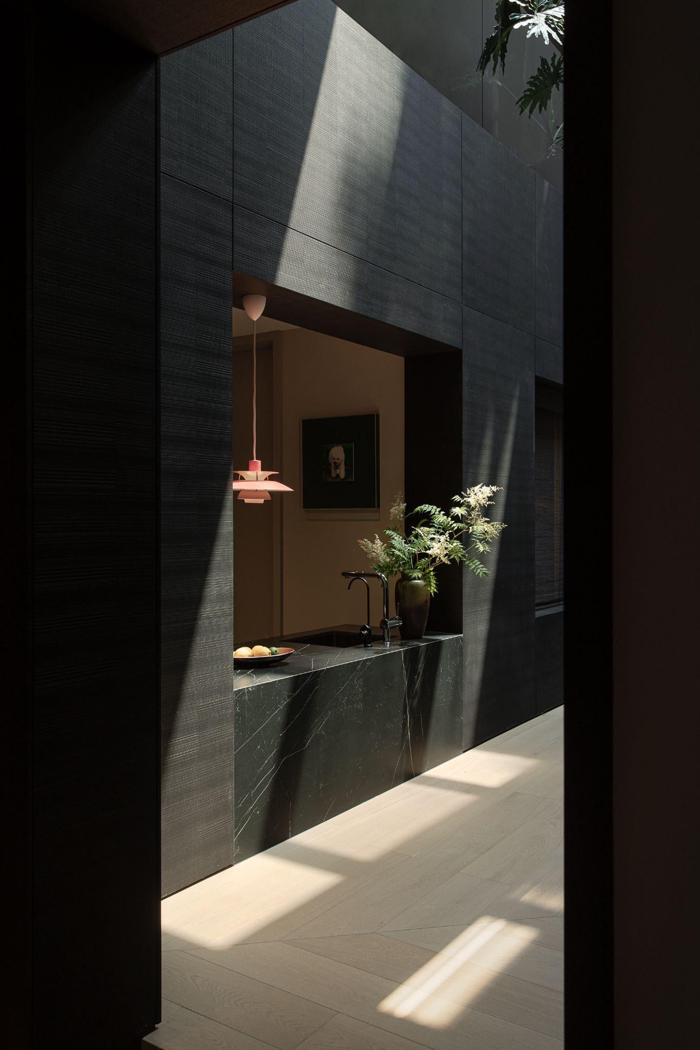Ánh sáng rọi thành vệt trên mảng tường xám than bên ngoài bếp, tạo chiều sâu thị giác mạnh. Không gian được mở qua các ô cửa lớn để kết nối trực quan với atrium