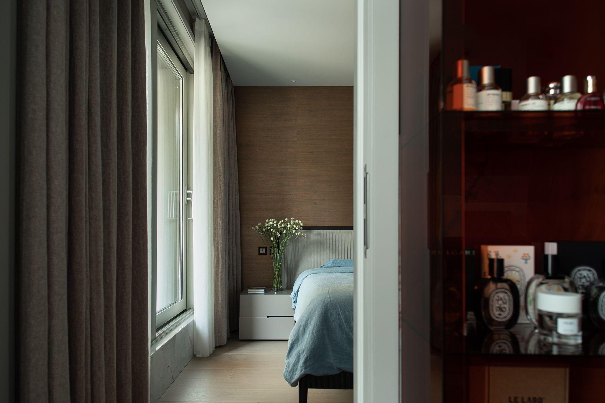 Ở khu vực phòng ngủ, bảng màu được làm dịu đi với gỗ tự nhiên, vải dệt, ánh sáng ấm. Các bức tường và phần đầu giường được xử lý đơn giản, không thêm nhiều hoạ tiết hay mảng trang trí gây rối mắt.