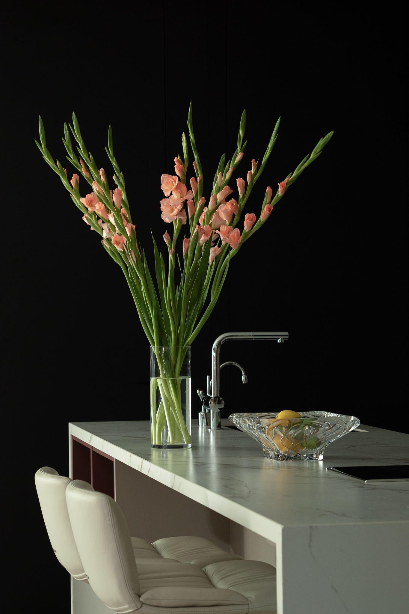Bình hoa lay-ơn hồng nổi bật trên mặt đảo bếp đá trắng, tạo sự cân bằng giữa chất lạnh của đá và sự mềm mại của thiên nhiên. Ánh sáng hướng vào bình hoa làm sâu sắc thêm bố cục tối giản