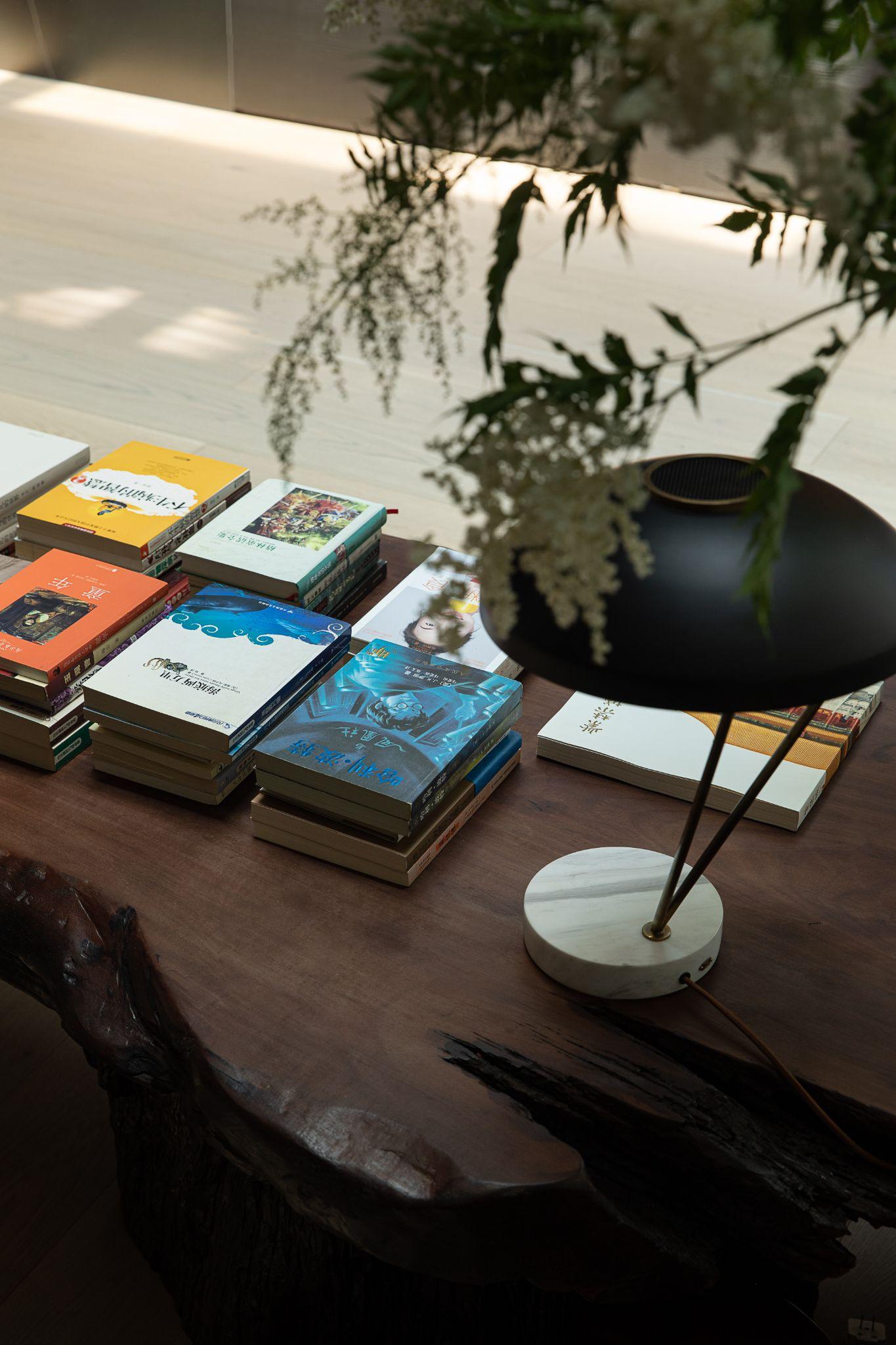 Cây xanh lớn cắm trong bình thuỷ tinh cùng tượng điêu khắc đặt trên bệ đá tạo điểm nhấn thẩm mỹ. Bàn sách gỗ thô cho thấy sự tôn trọng chất liệu tự nhiên của công trình