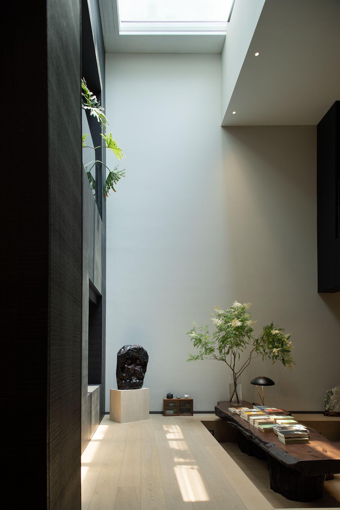 Khoảng thông tầng cao vút cho phép ánh sáng tràn xuống mặt sàn gỗ sáng màu. Cây xanh và điêu khắc đặt dưới giếng trời làm nổi bật cảm giác yên bình của không gian