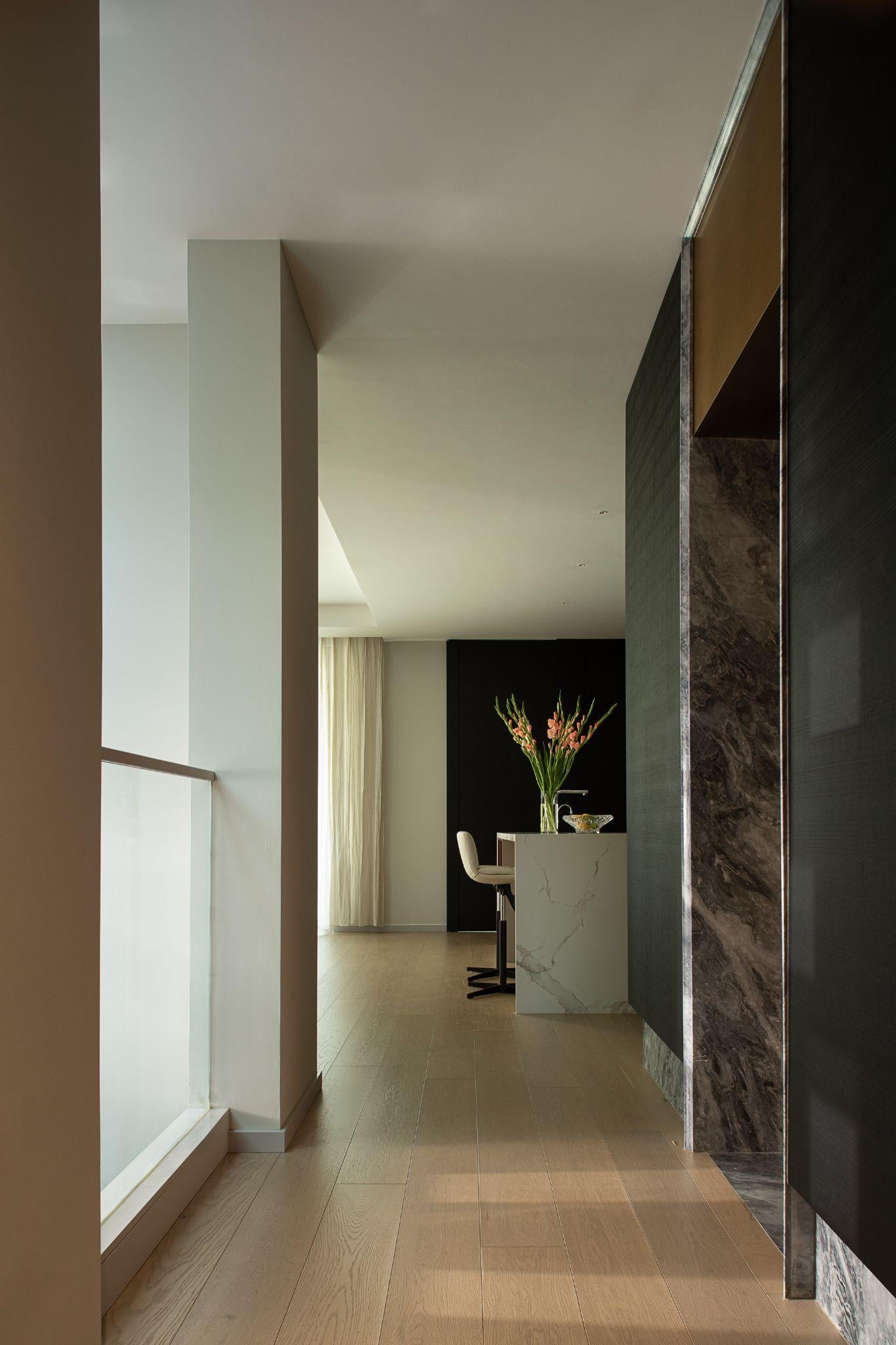 Hành lang sáng dịu dẫn vào khu bếp nhỏ với đảo bếp đá trắng. Tỷ lệ cao - thoáng giúp hành lang trở thành điểm nghỉ mắt thay vì chỉ là lối đi