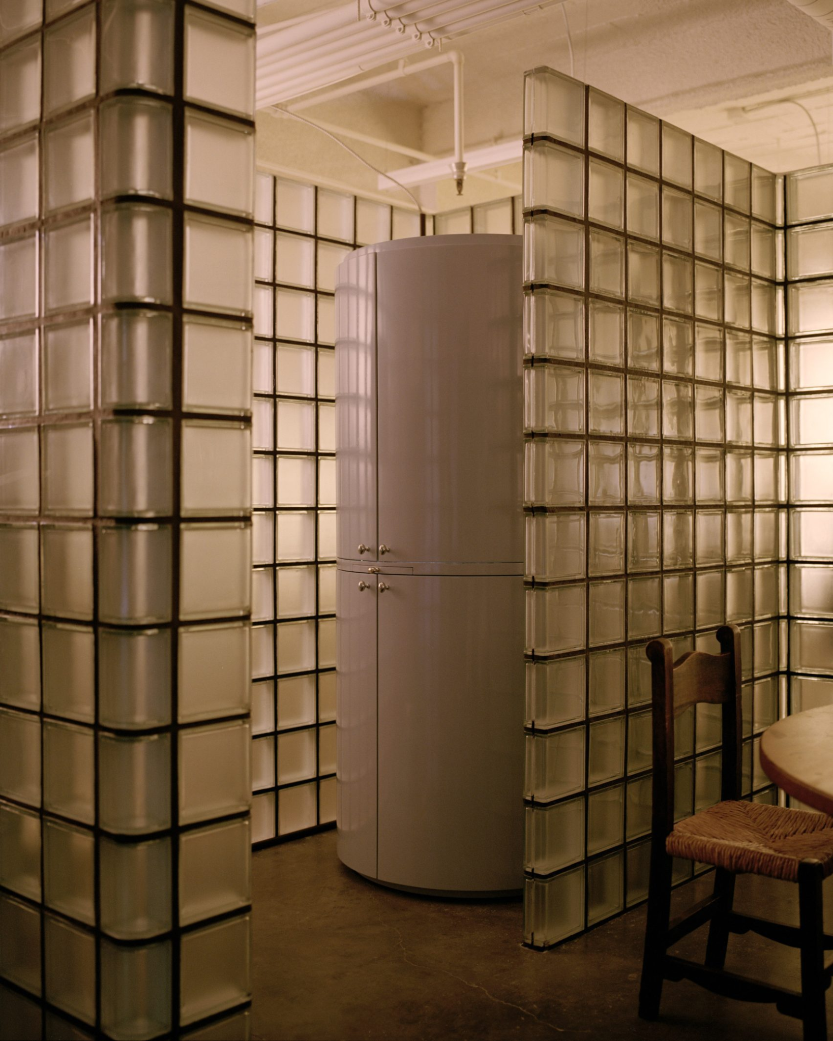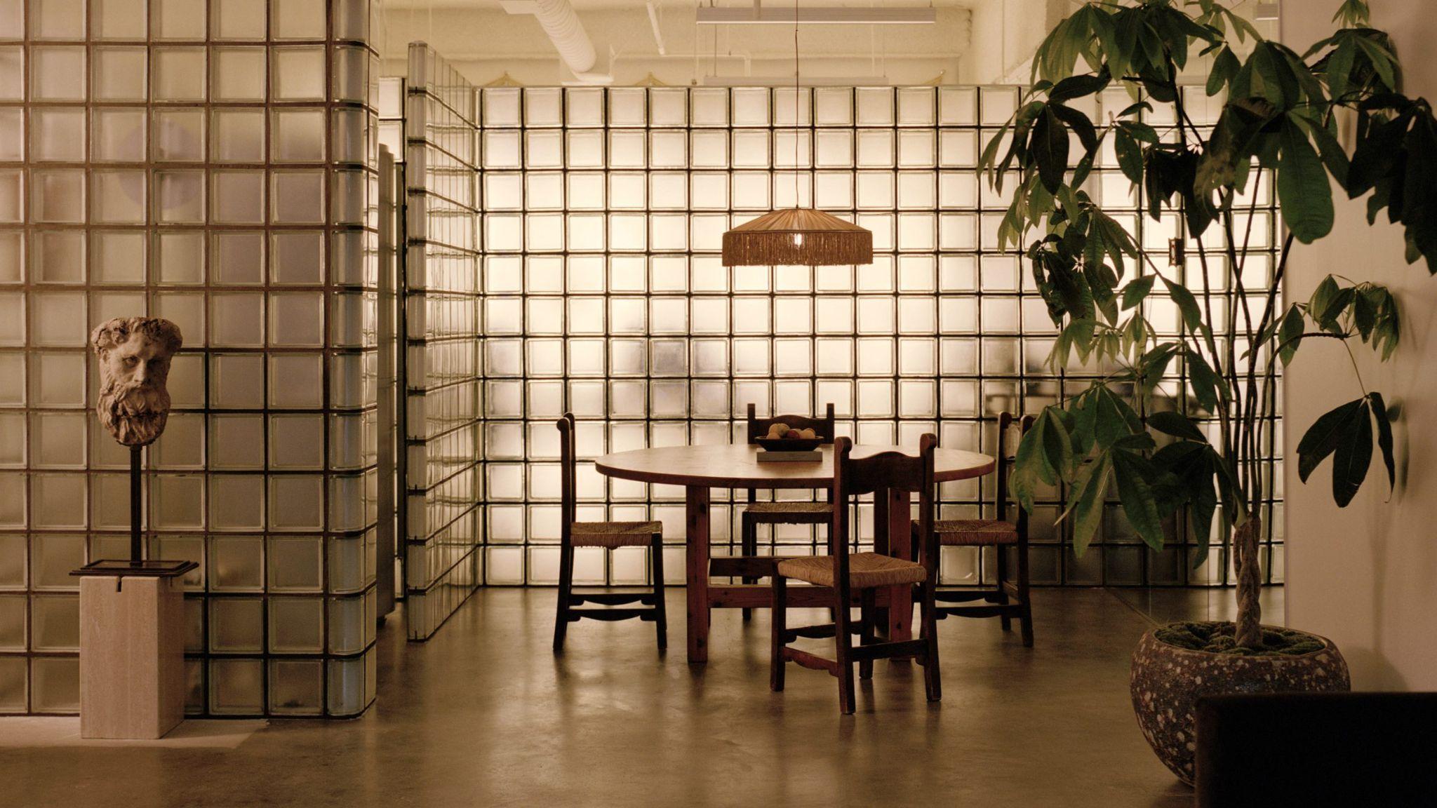 Bên trong chiếc hộp ánh sáng này là một chiếc bàn gỗ tròn với bốn chiếc ghế, được chiếu sáng bởi một chiếc đèn treo vải tua rua. Những chiếc đèn trang trí cũng mang phong cách cổ điển, mềm mại, đối lập với sự lạnh lẽo, cứng rắn của gạch kính.