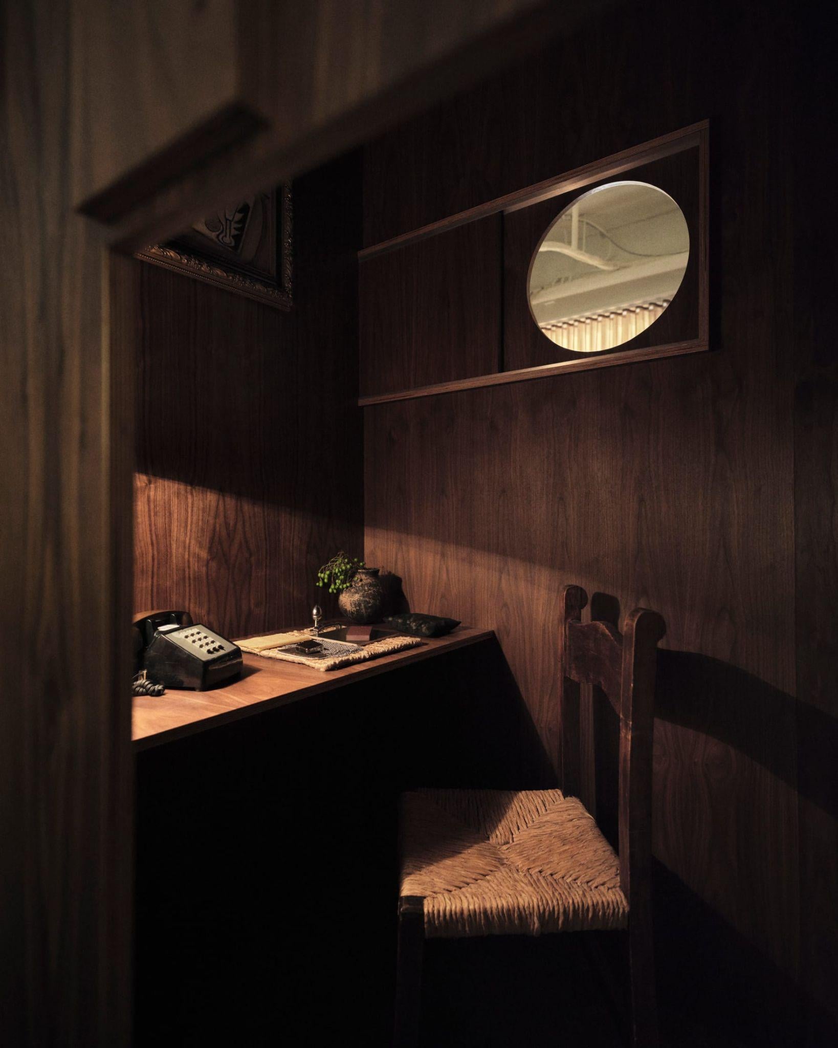 Nổi bật trên nền gỗ óc chó của khu vực phòng khách là một buồng điện thoại được thiết kế riêng. Đây là sản phẩm hợp tác giữa Aunt Studio và Waka Waka. Điểm nhấn khu vực này là chất liệu gỗ tối màu, tích hợp một ô cửa sổ tròn gợi nhớ đến kiến trúc hàng hải hay những con tàu vũ trụ trong phim viễn tưởng thập niên 70, tạo cảm giác vừa hoài cổ vừa có tầm nhìn tương lai. Nó cung cấp một không gian trú ẩn cho những cuộc gọi cần sự riêng tư tuyệt đối, giải quyết bài toán tiếng ồn trong không gian mở một cách đầy thẩm mỹ.