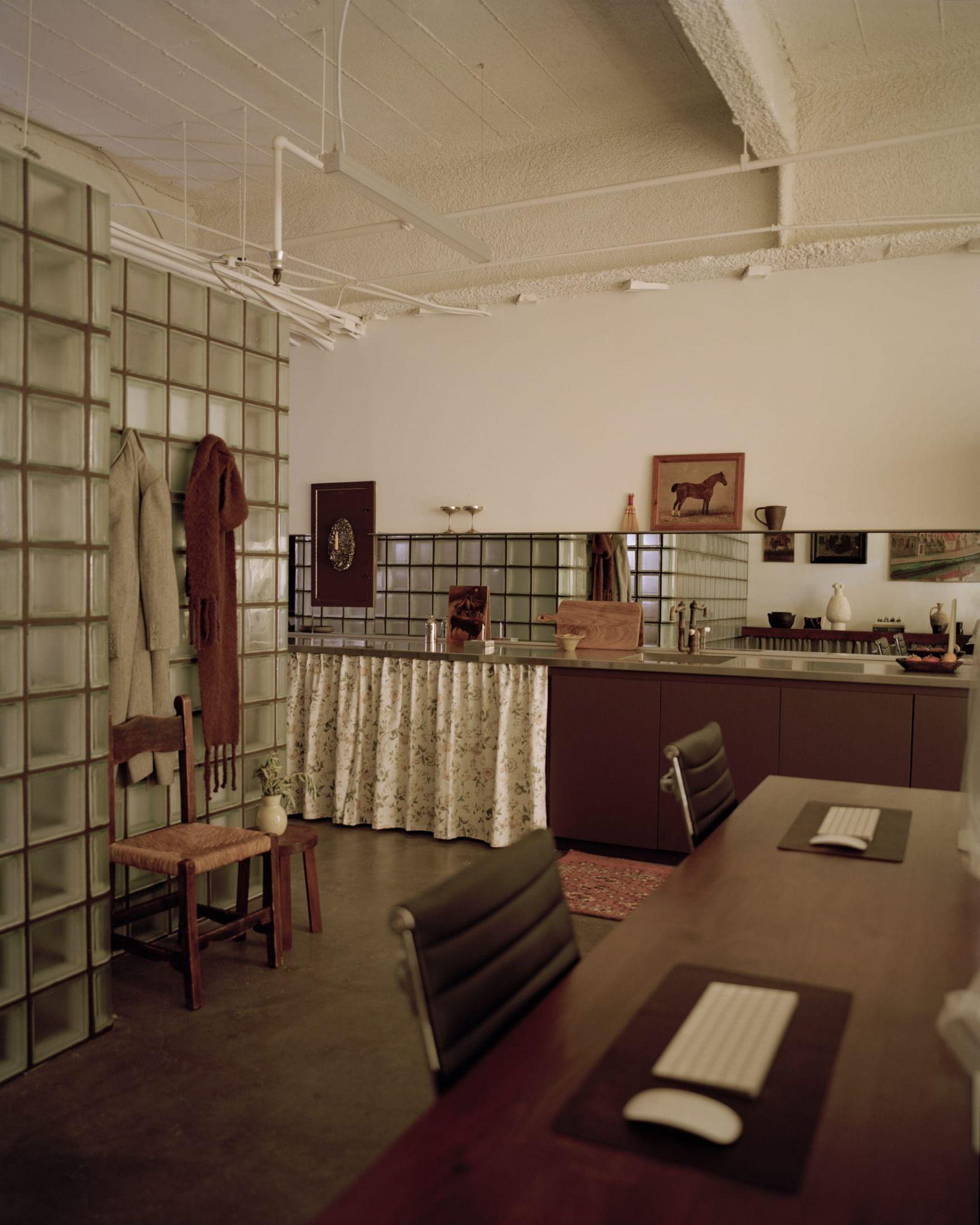 Chi tiết kiến trúc đắt giá nhất trong khu vực này chính là tấm rèm sân khấu màu vàng bao trùm toàn bộ không gian. Tại Los Angeles, ánh nắng buổi chiều thường rất gắt. Thay vì dùng rèm cuốn nhựa văn phòng, Aunt Studio sử dụng tấm rèm vải màu vàng rực rỡ này như một bộ lọc ánh sáng. Khi ánh nắng xuyên qua lớp gạch kính và đi qua lớp vải vàng, nó được nhuộm màu và khuếch tán, biến thành một thứ ánh sáng màu hổ phách.