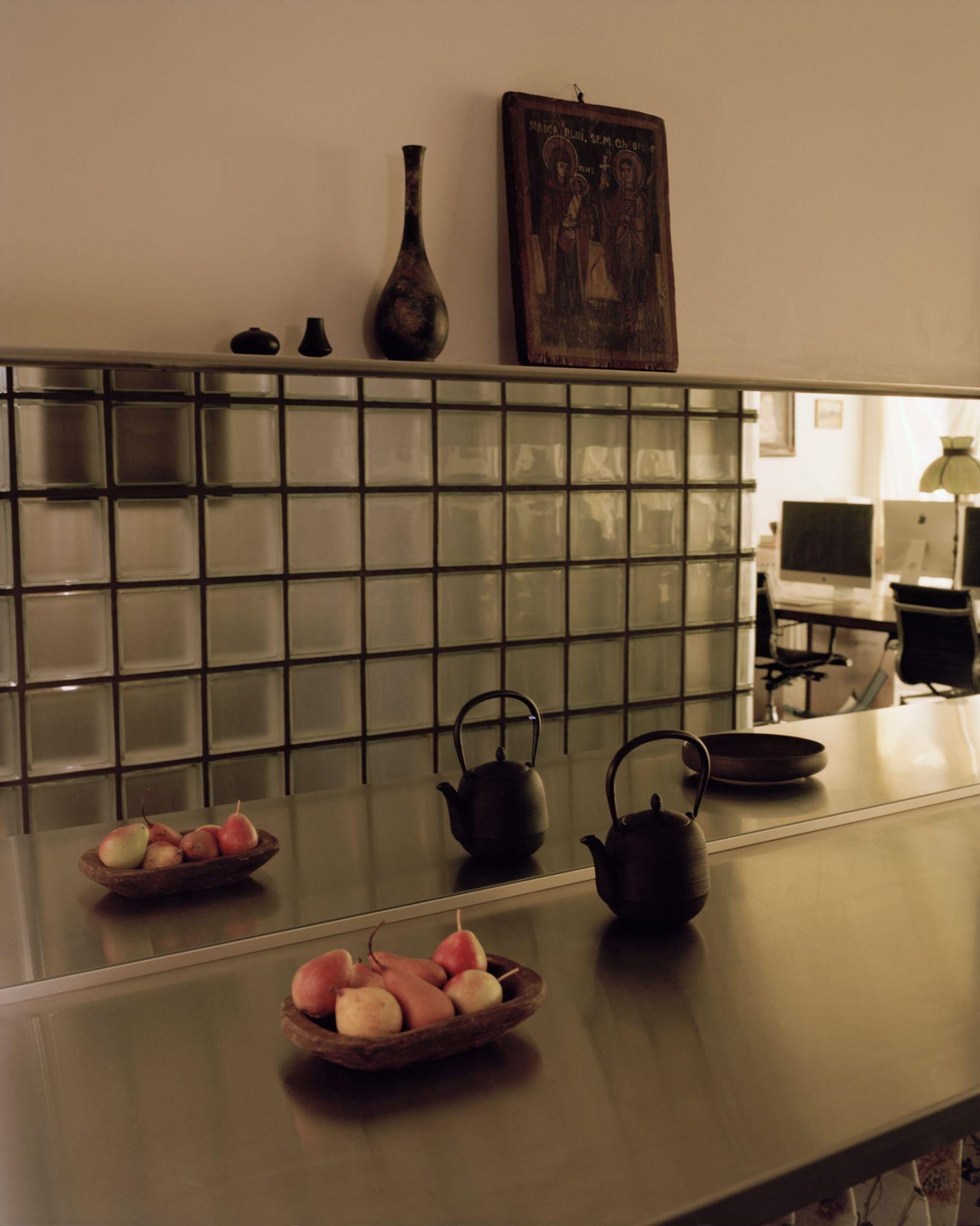 Rời phòng khách, ta tiến vào khu vực phòng ăn. Ranh giới giữa hai khu vực này được xác định bởi những vách ngăn bằng gạch kính. Việc sử dụng gạch kính là một sự kính ngưỡng trực tiếp đến kiệt tác kiến trúc Maison de Verre tại Paris. Vật liệu này có khả năng vừa chia cắt, vừa kết nối. Nó chặn tầm nhìn chi tiết để tạo sự riêng tư, nhưng lại cho phép ánh sáng xuyên qua và khuếch tán, tạo nên một hiệu ứng ánh sáng mờ ảo lung linh như ngọc.