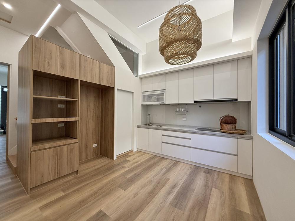 Sự sắp đặt song song giữa đảo bếp và bàn ăn tạo ra một dòng chảy di chuyển mượt mà cho việc nấu nướng và phục vụ. Quan trọng hơn, nó khuyến khích sự tương tác không lời: người vợ đang làm bếp vẫn có thể trò chuyện với chồng hoặc học viên đang ngồi tại bàn ăn, biến gian bếp thực sự trở thành trái tim ấm áp của ngôi nhà.