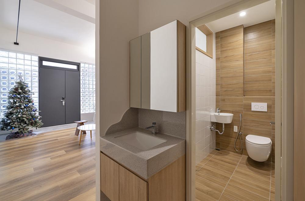 Vị trí mới ở phía trước giúp học viên và khách vãng lai tiếp cận dễ dàng mà không cần đi sâu vào khu vực sinh hoạt riêng tư phía sau. KTS đã tách bồn rửa tay ra khỏi phòng vệ sinh và đặt ở không gian bên ngoài. TS đã ốp gạch vân gỗ cho toàn bộ mảng tường và sàn khu vực tạo ra sự đồng bộ với ngôn ngữ gỗ của mặt tiền và sàn phòng khách, xóa bỏ cảm giác lạnh lẽo thường thấy của gạch men vệ sinh thông thường.