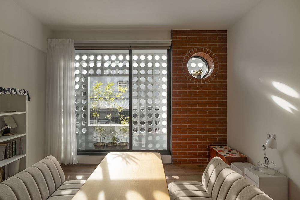 Lớp gạch hoa gió không chỉ chắn nắng gắt hướng Tây mà còn lọc bỏ những hình ảnh lộn xộn bên ngoài, giữ lại sự riêng tư và tĩnh tại cho gia chủ