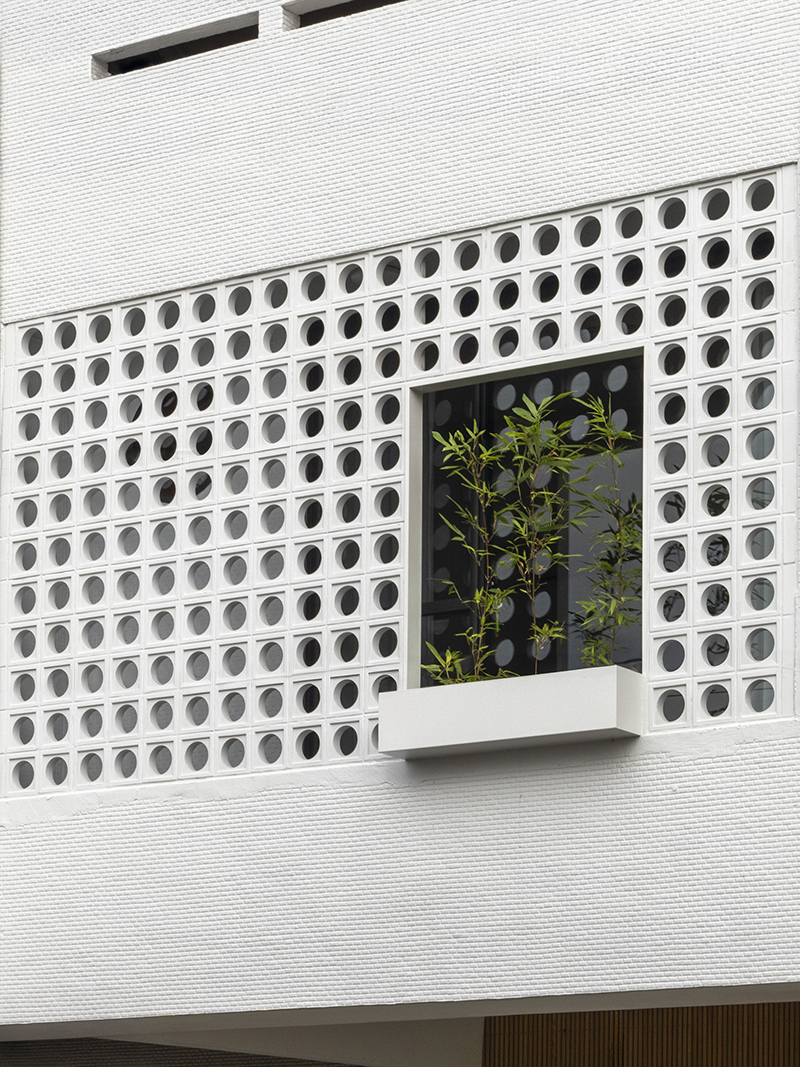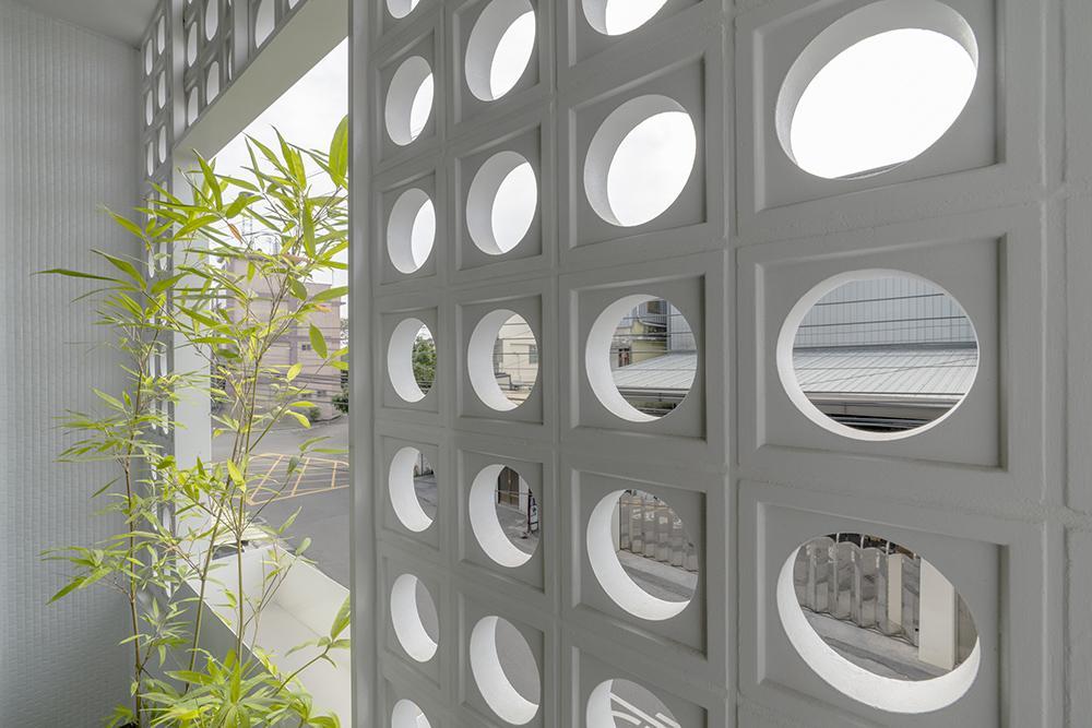 Tại tầng 2 và mặt tiền, gạch bông gió được sử dụng như một tấm rèm bê tông kiên cố nhưng thoáng khí. Về mặt vật lý, lớp gạch này đóng vai trò chắn nắng hướng Tây cực kỳ hiệu quả, cản tới 50% bức xạ nhiệt, giúp không gian bên trong luôn mát mẻ nhờ luồng khí đối lưu qua các ô thoáng.