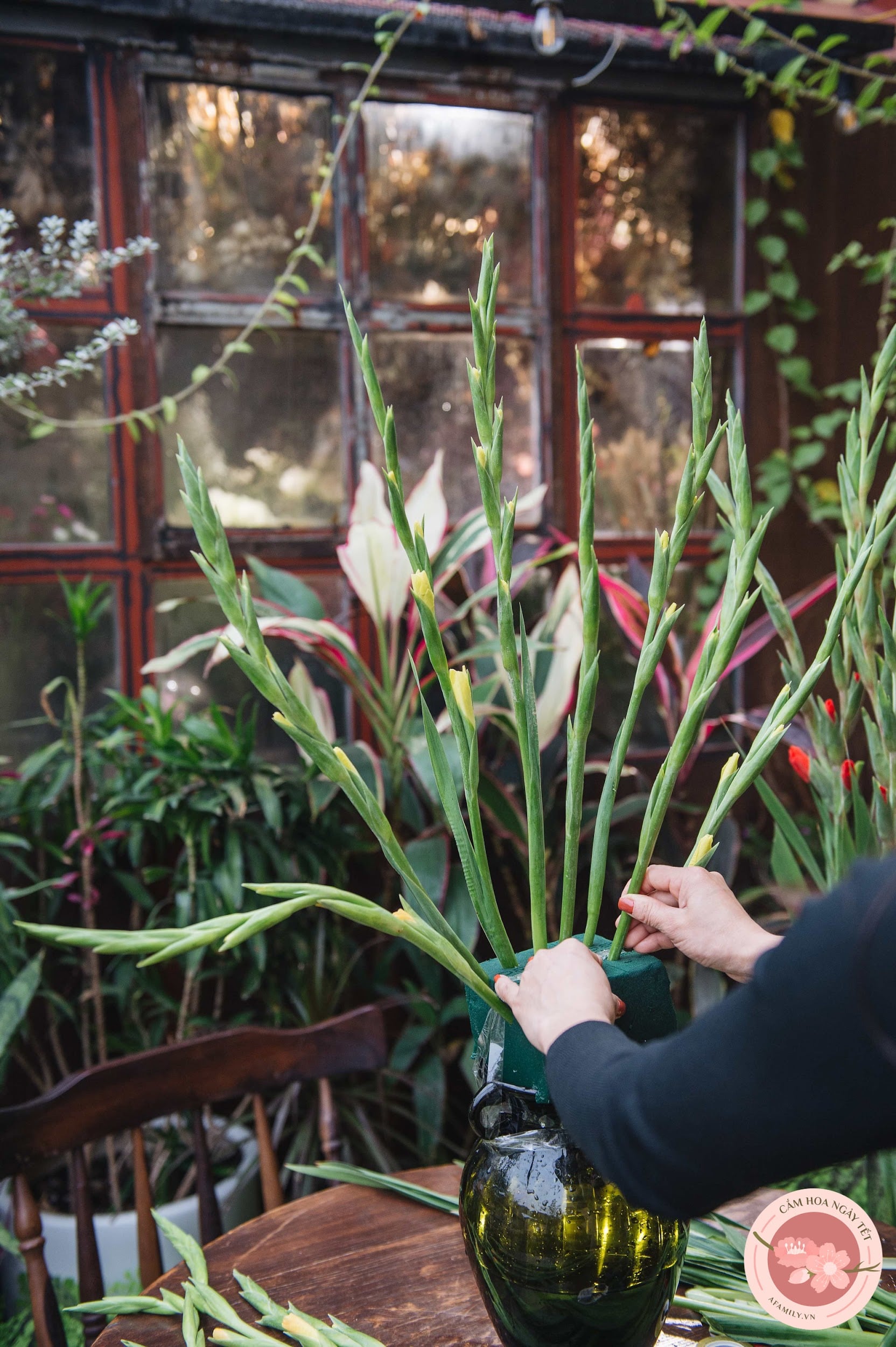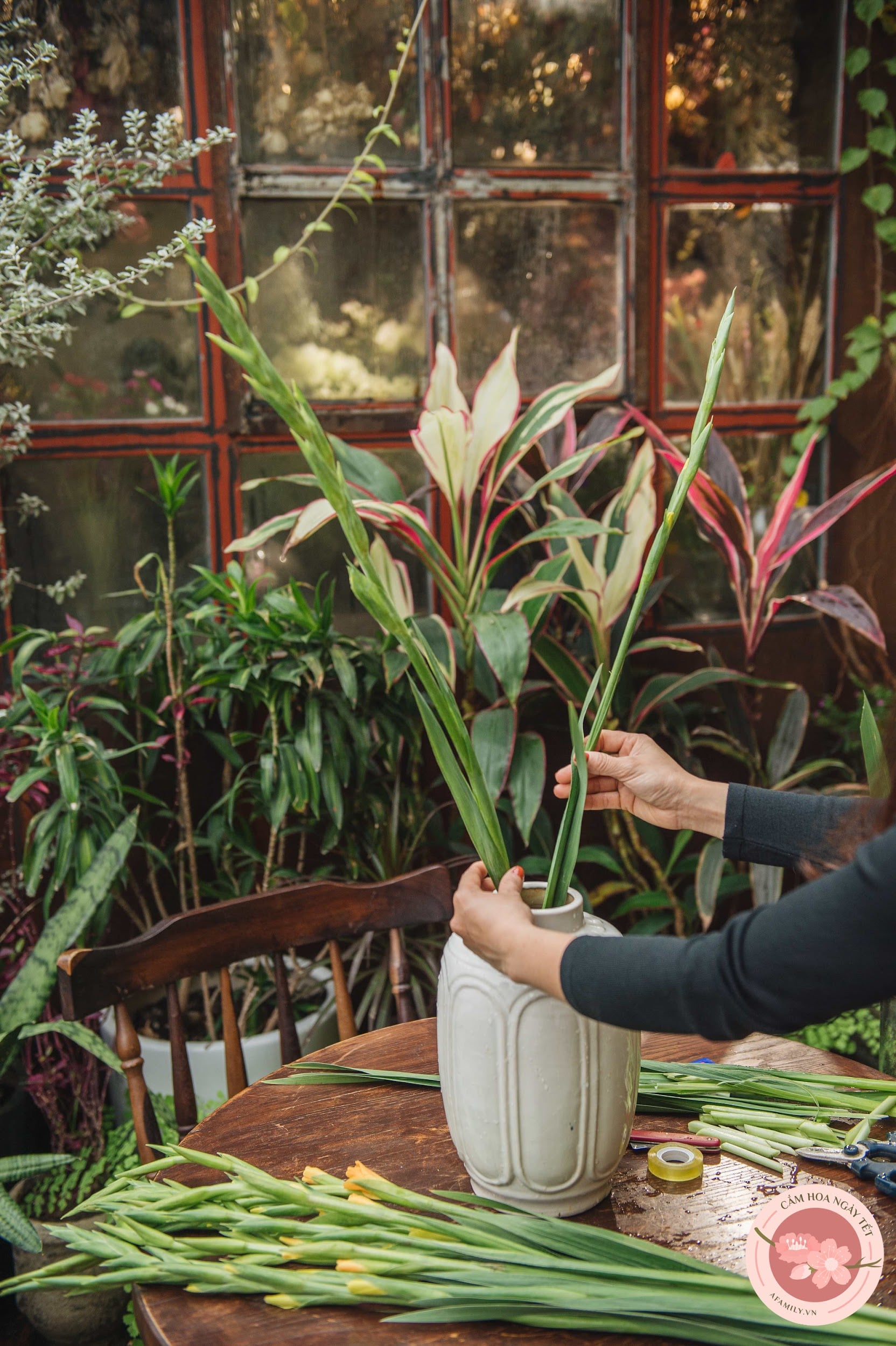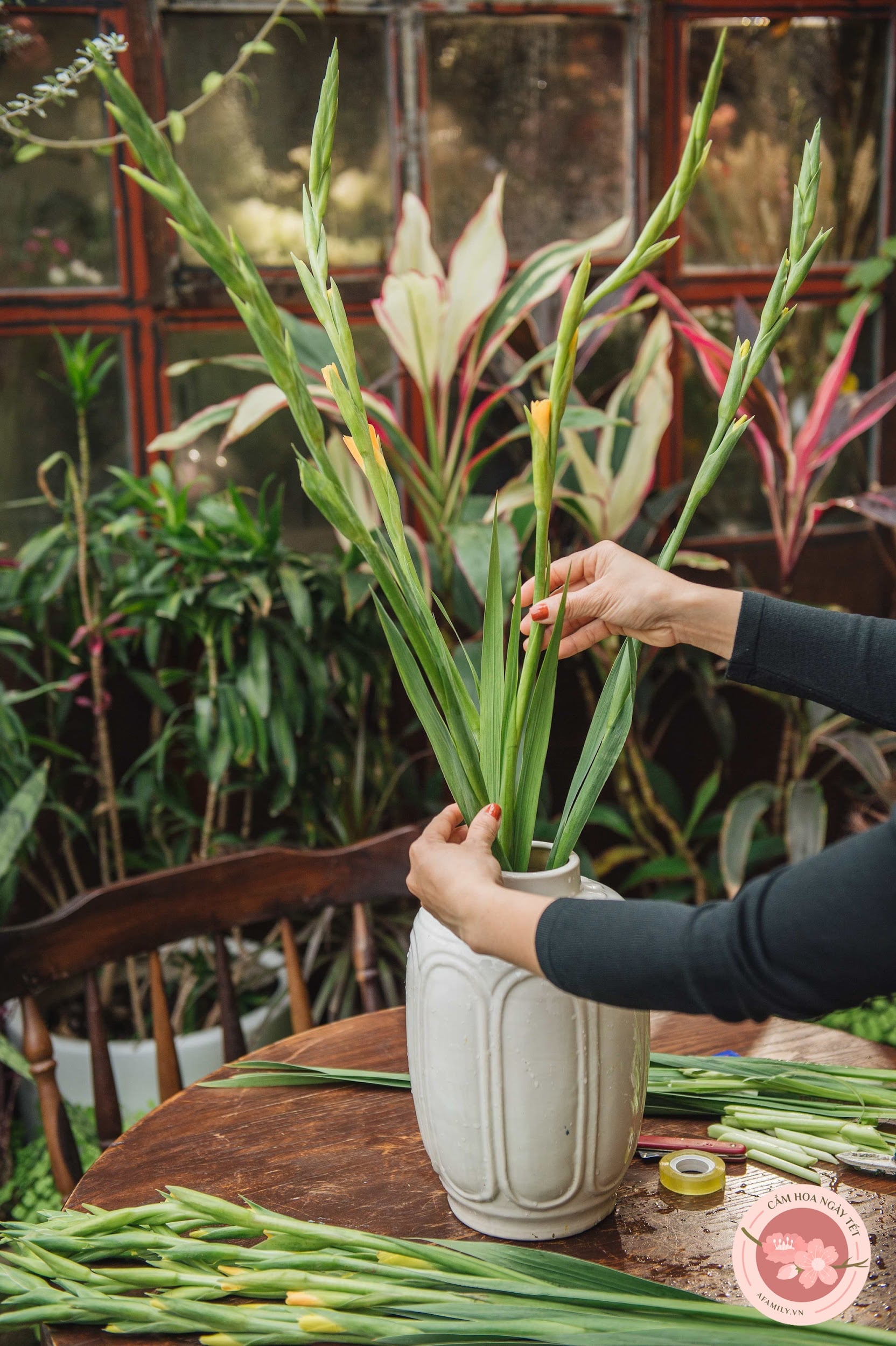 Thả từng cành lay ơn vào bình và căn chỉnh hướng tự nhiên.