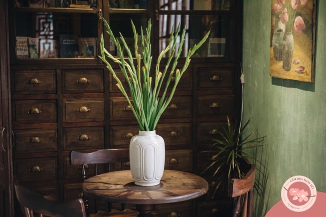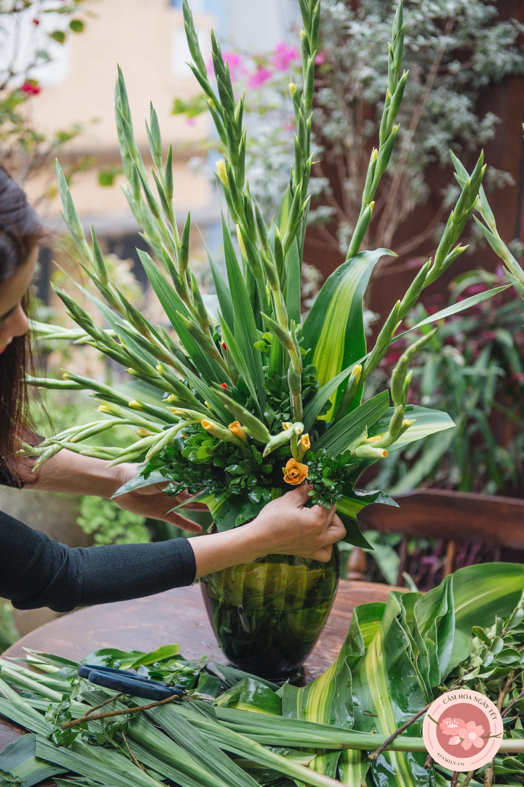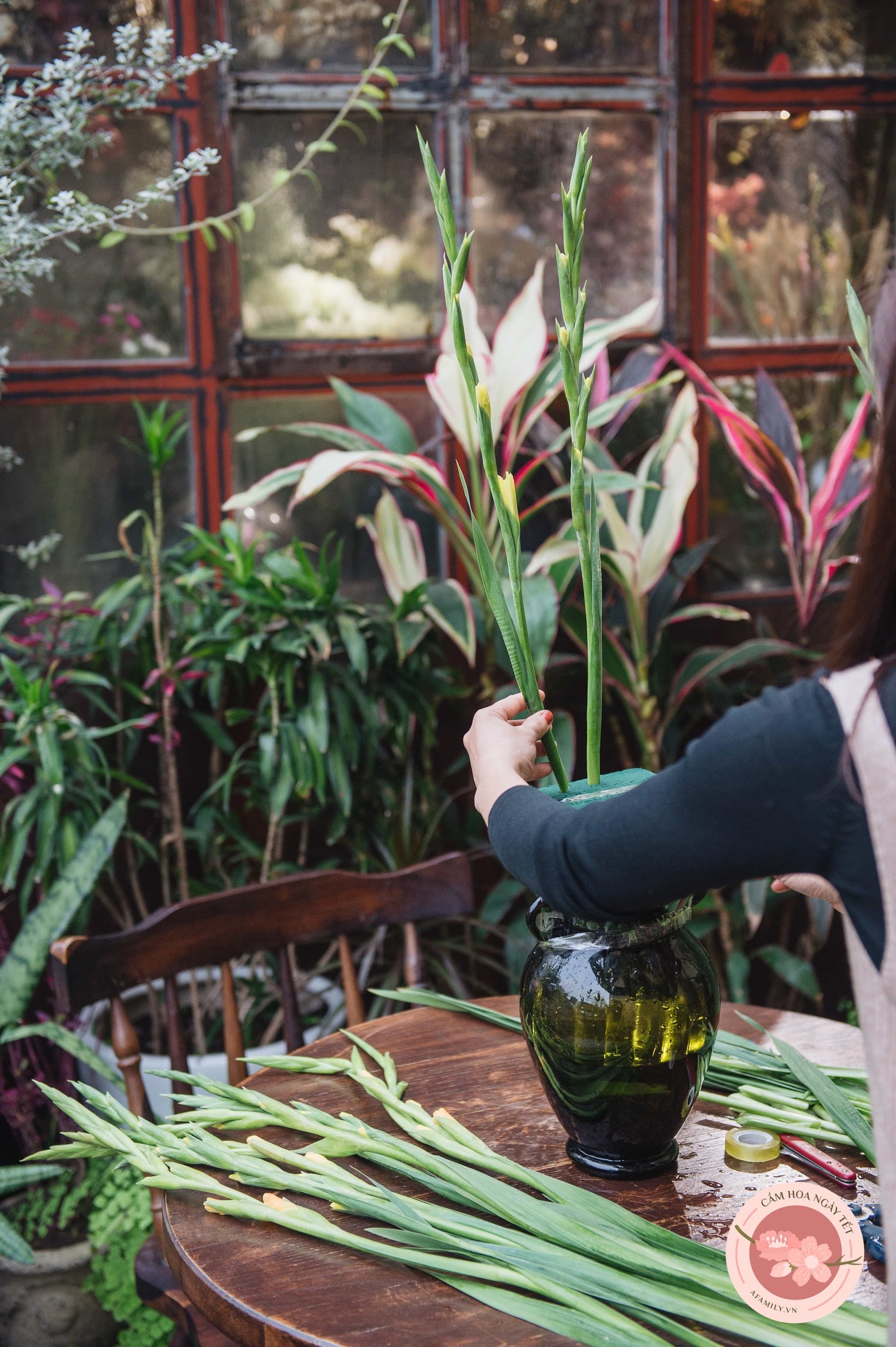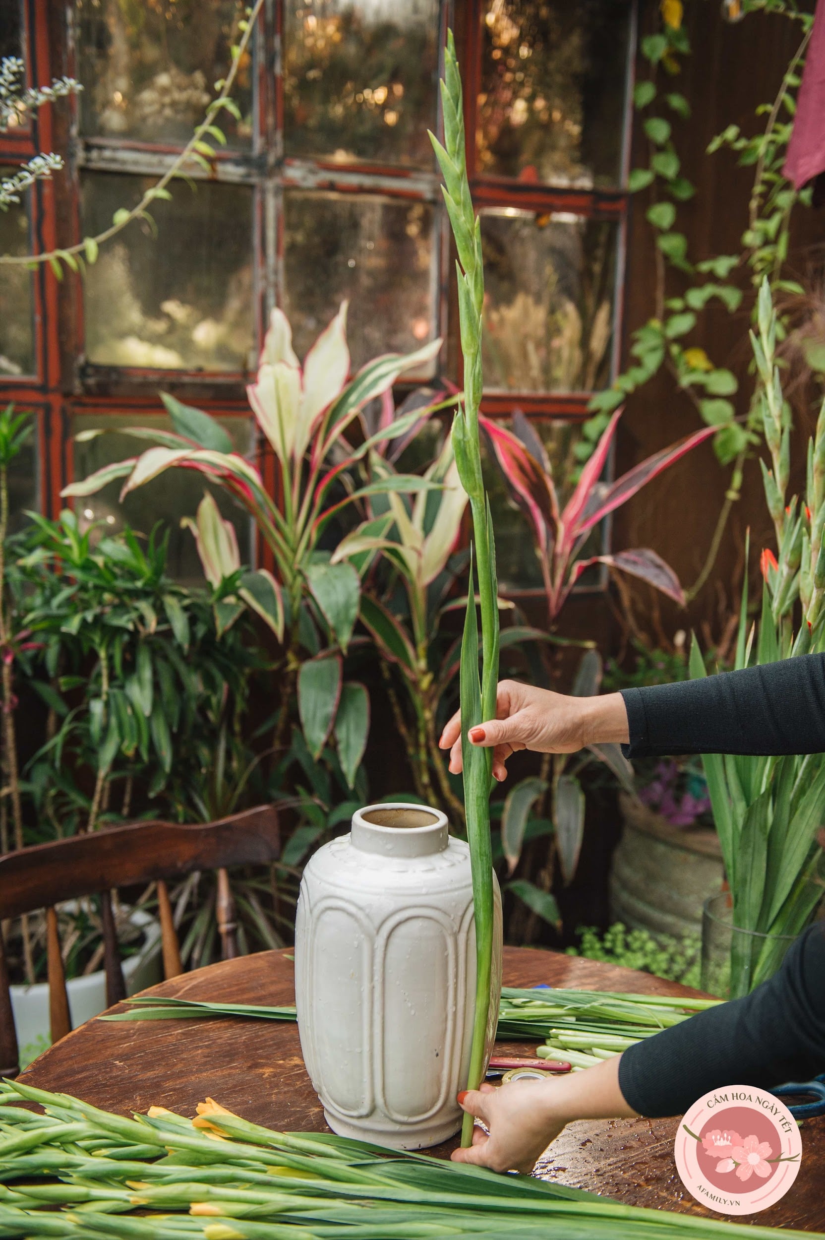 Thả từng cành lay ơn vào bình và căn chỉnh hướng tự nhiên.