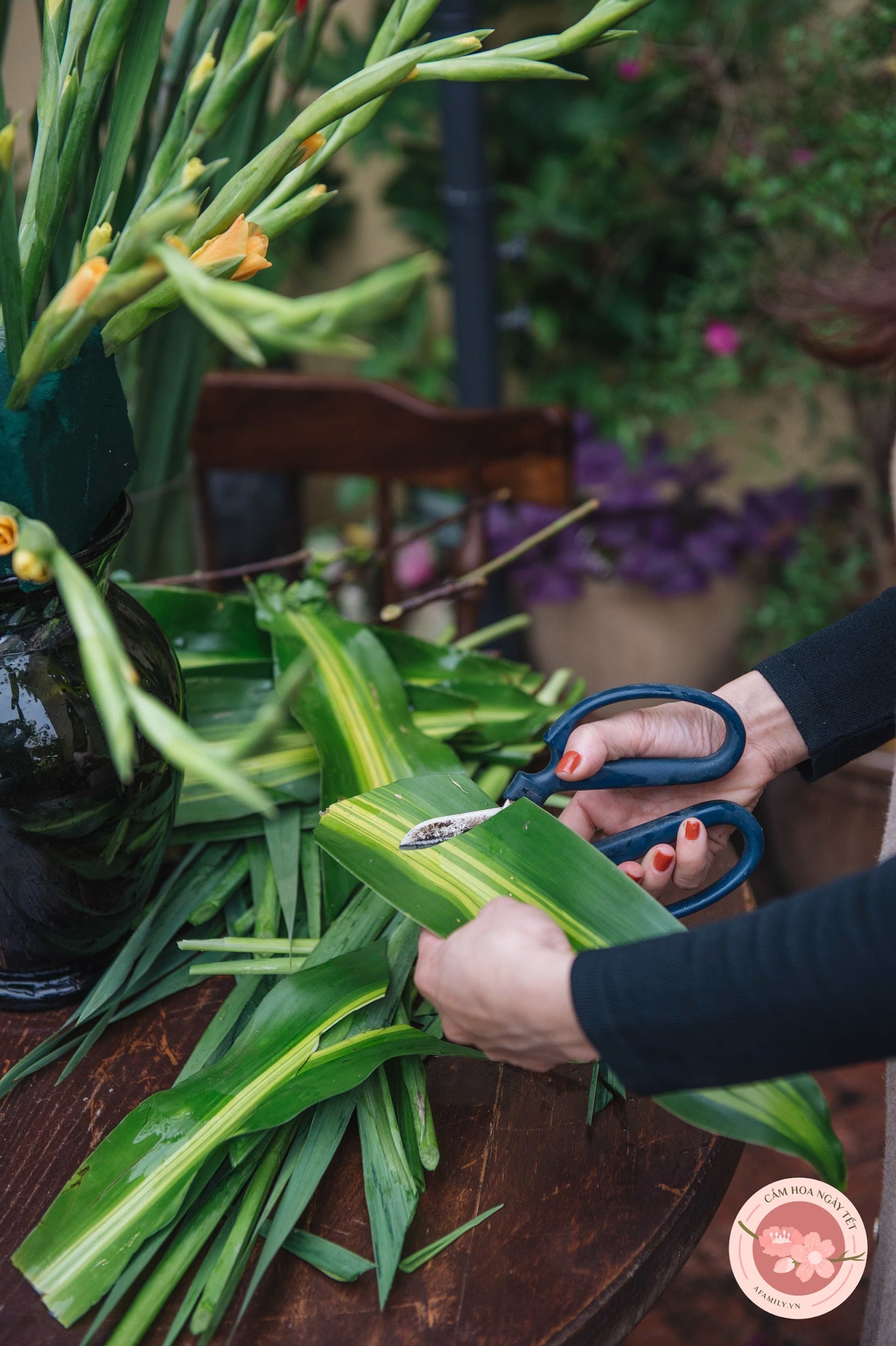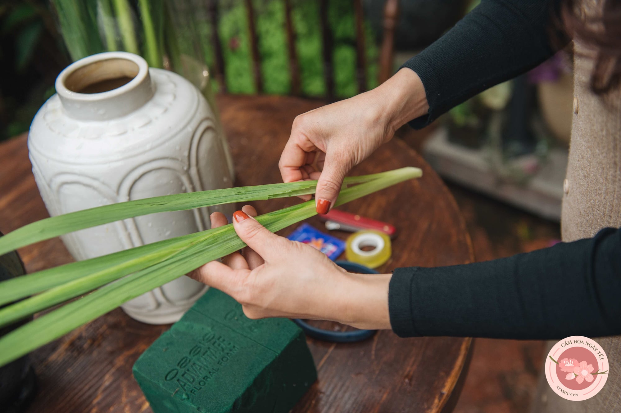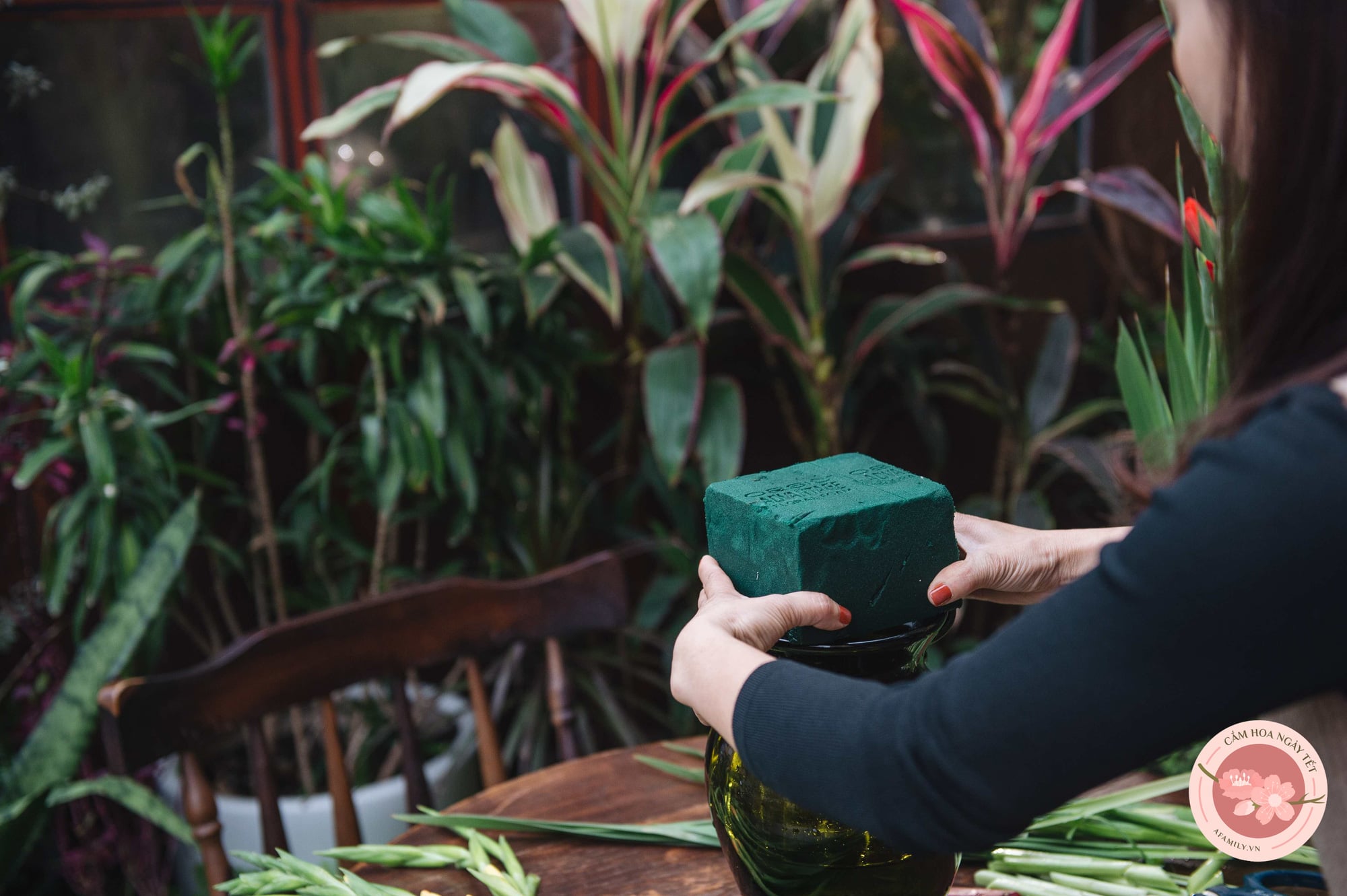 Dùng lá lay ơn hoặc lá thiết mộc lan, lá ngâu để phủ kín xốp, giúp bình hoa đẹp tự nhiên hơn.