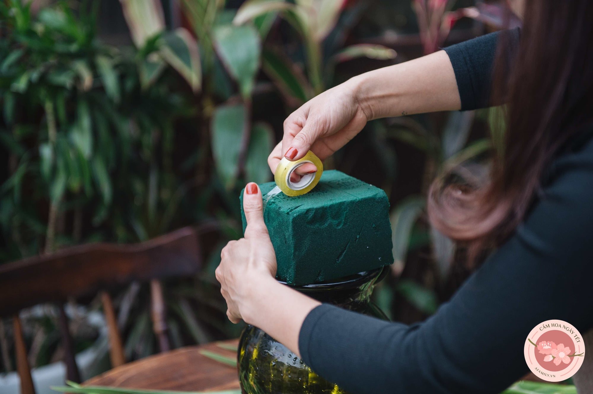 Đặt mút xốp lên miệng bình và dùng băng dính cố định thật chắc để tạo nền cắm.