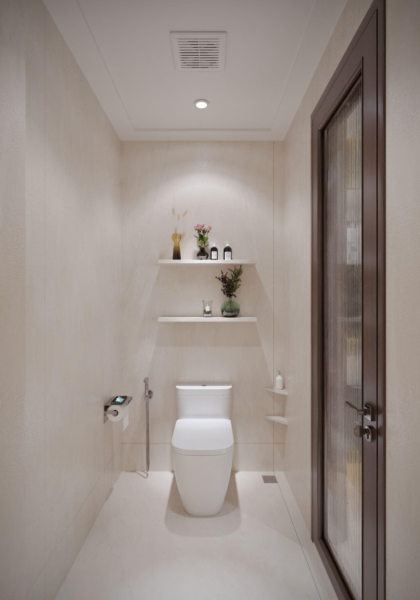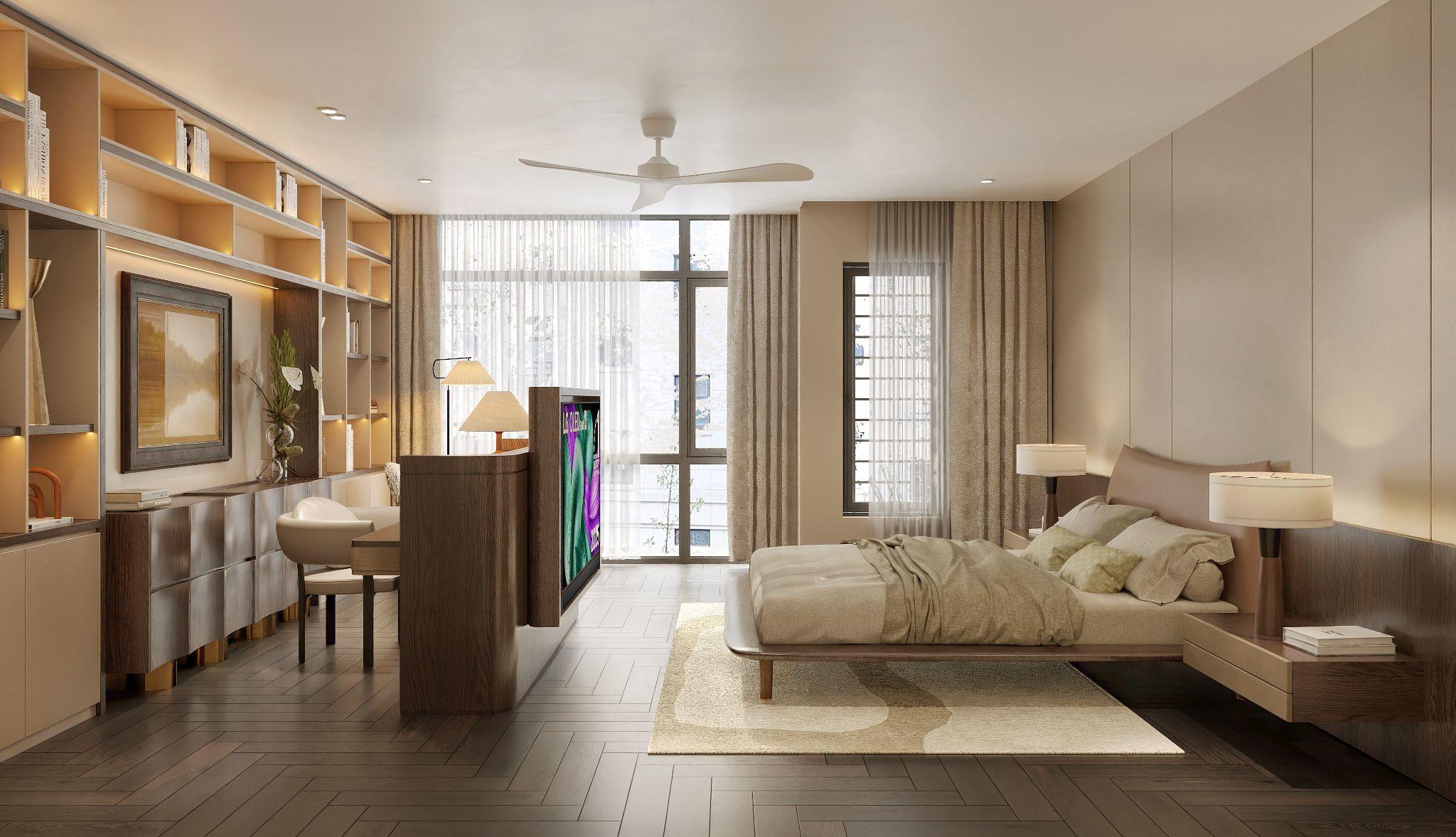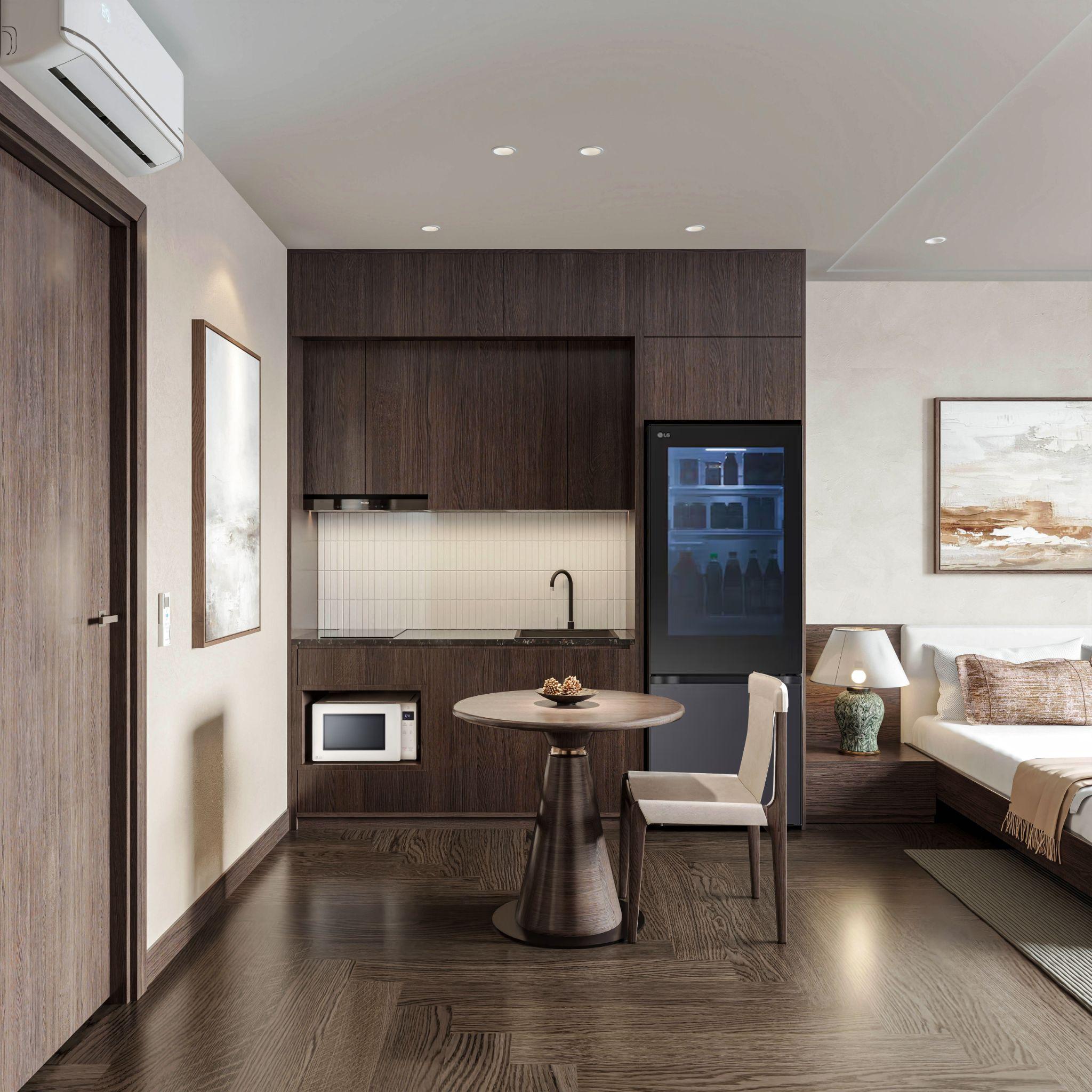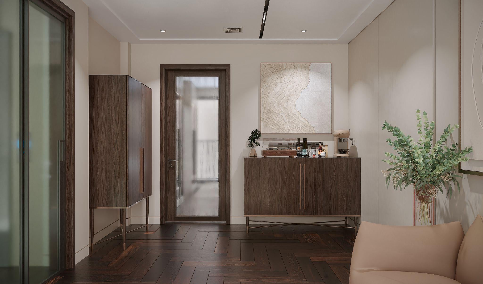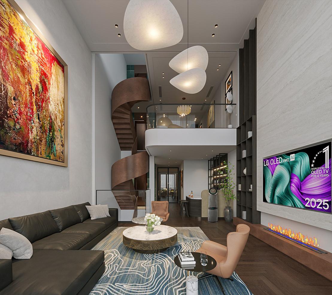 Không gian nội thất đi theo bảng màu trung tính nâu, be, trắng kết hợp chất liệu đá, gỗ veneer và ánh sáng vàng ấm áp, tạo nên sự ấm cúng nhưng vẫn giữ tinh thần hiện đại, tối giản. Điểm cộng lớn là các giải pháp lưu trữ âm tường giúp nhà luôn gọn gàng, không có cảm giác chật chội dù được xây cao tầng.