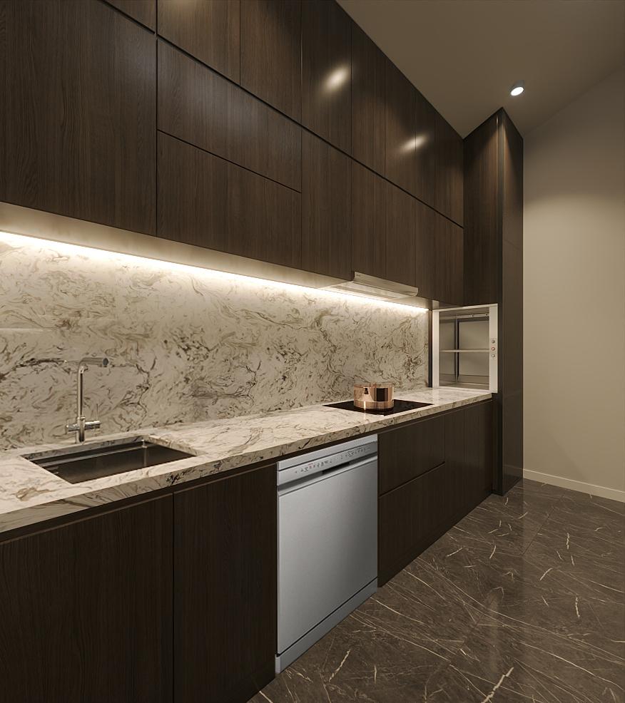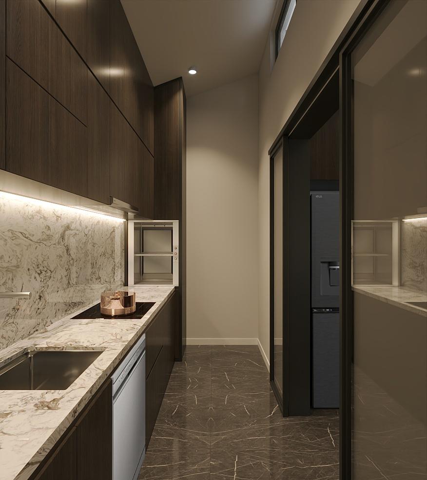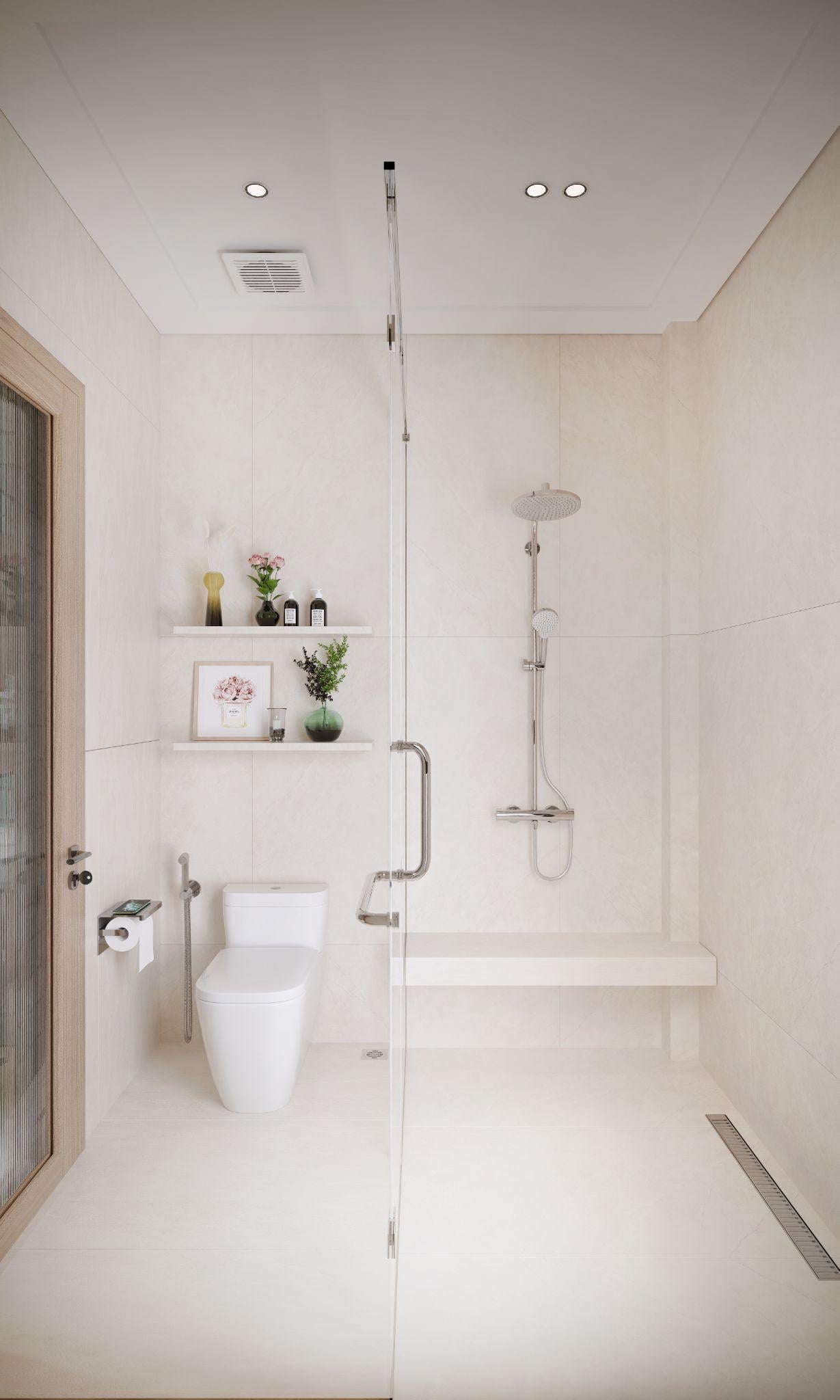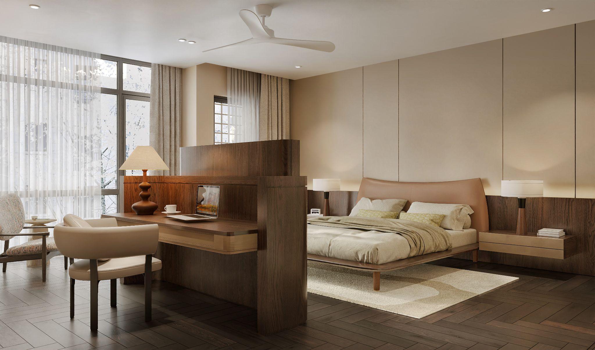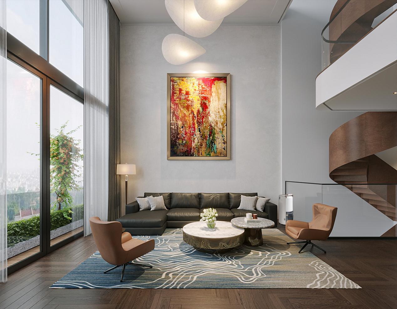 Không gian nội thất đi theo bảng màu trung tính nâu, be, trắng kết hợp chất liệu đá, gỗ veneer và ánh sáng vàng ấm áp, tạo nên sự ấm cúng nhưng vẫn giữ tinh thần hiện đại, tối giản. Điểm cộng lớn là các giải pháp lưu trữ âm tường giúp nhà luôn gọn gàng, không có cảm giác chật chội dù được xây cao tầng.