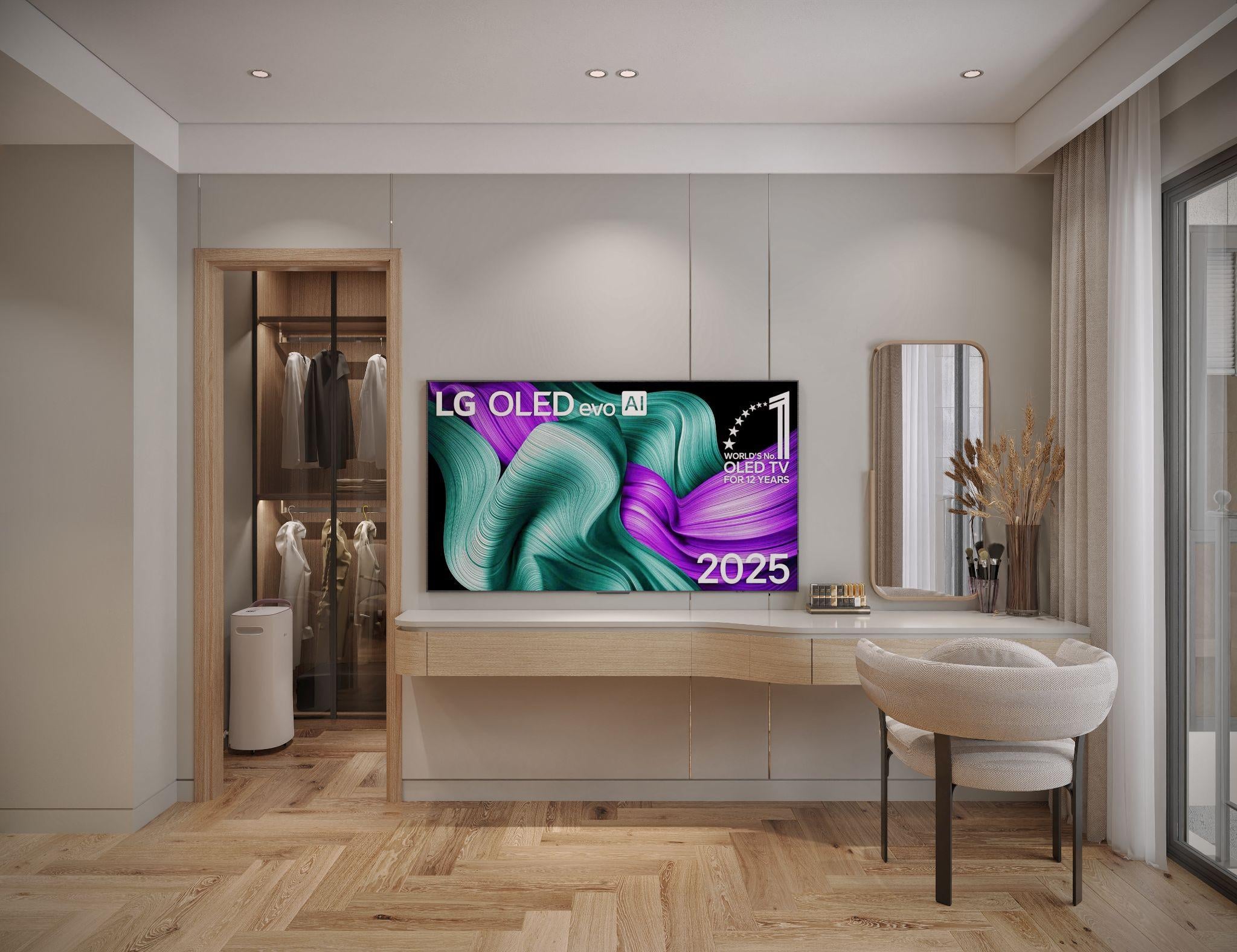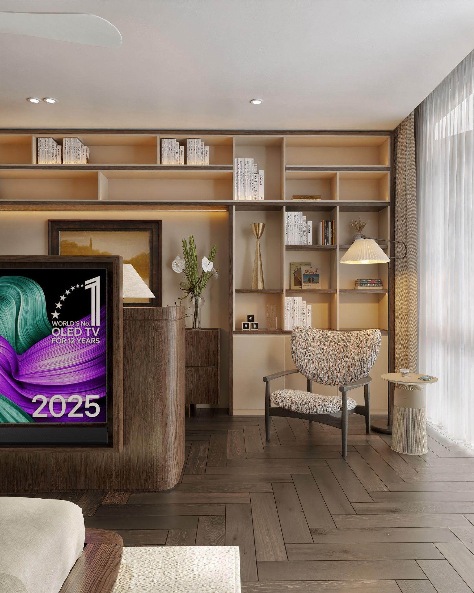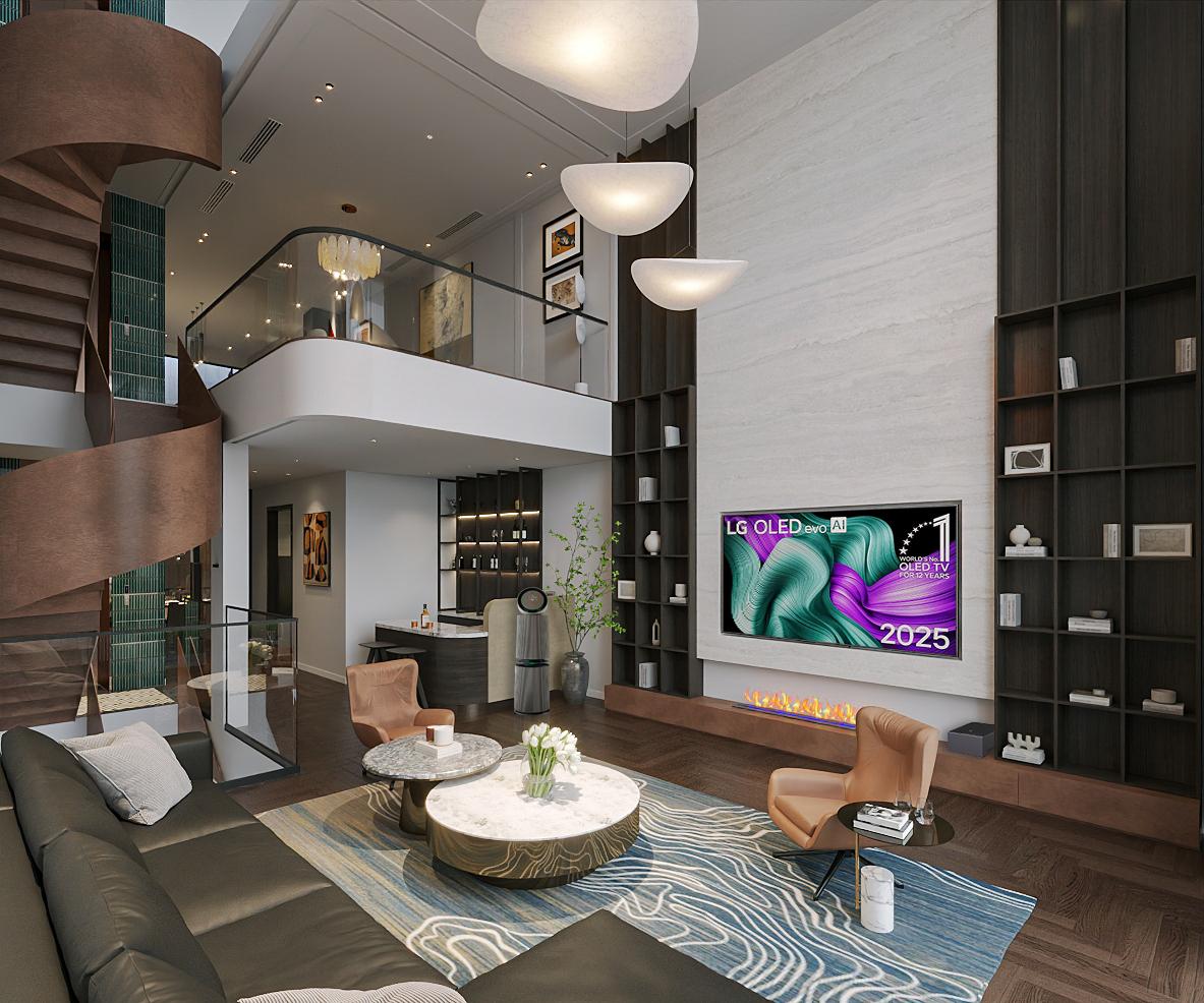 Ngay từ phòng khách, chiếc TV OLED M5 trở thành trung tâm giải trí nổi bật, đồng thời hài hòa với tổng thể nội thất gỗ. Đối diện sofa là máy lọc khí LG PuriCare™ AeroBooster, hỗ trợ làm sạch không khí cho toàn bộ tầng sinh hoạt chung.
