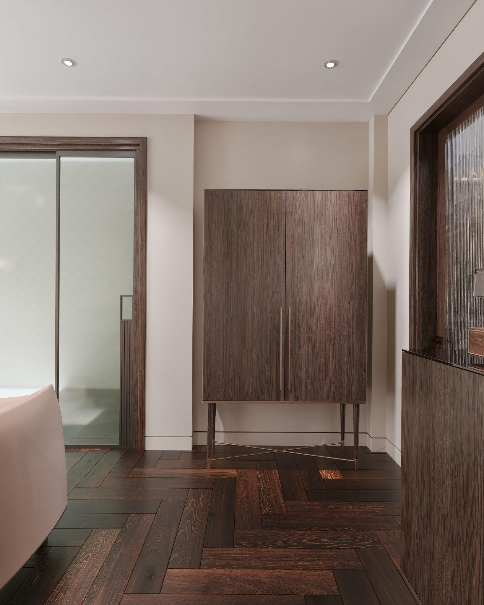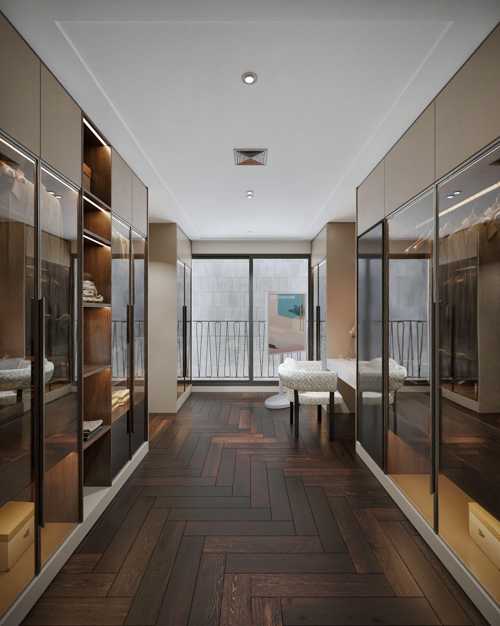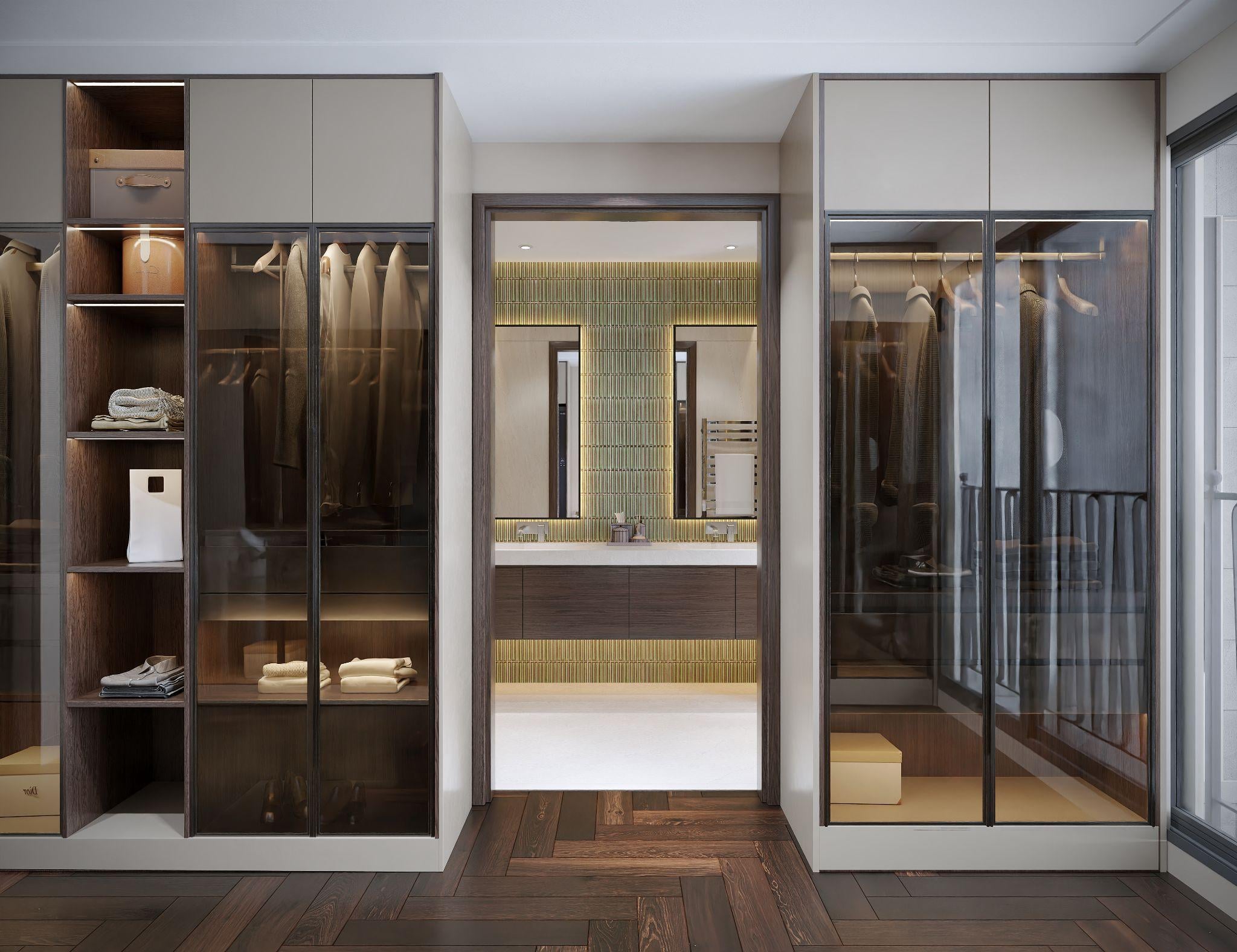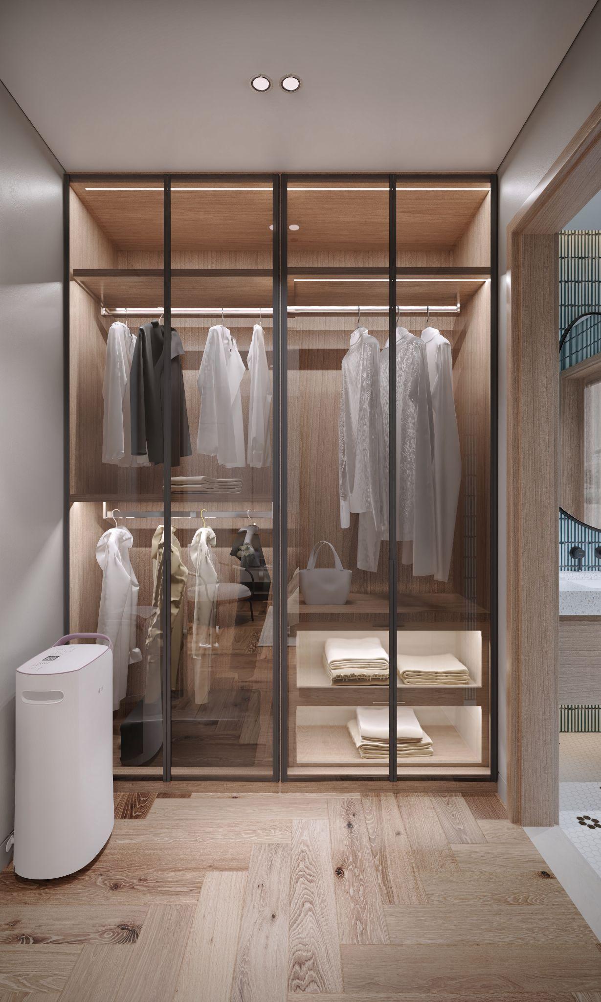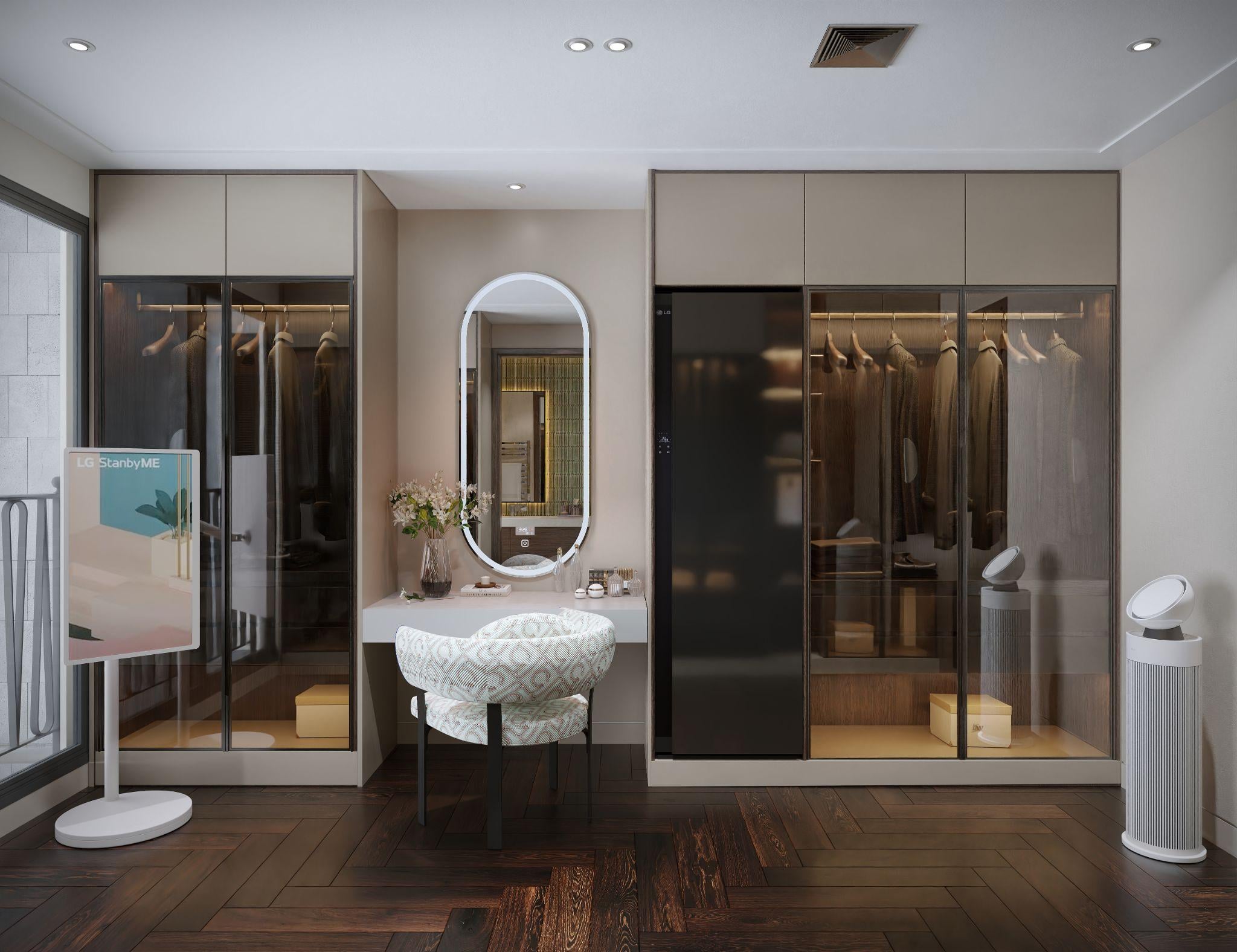 Phòng thay đồ riêng biệt của người lớn được bố trí tủ chăm sóc quần áo thông minh LG Styler đen, giúp làm mới đồ mặc hàng ngày nhanh chóng, đồng thời bảo vệ chất lượng vải vóc.