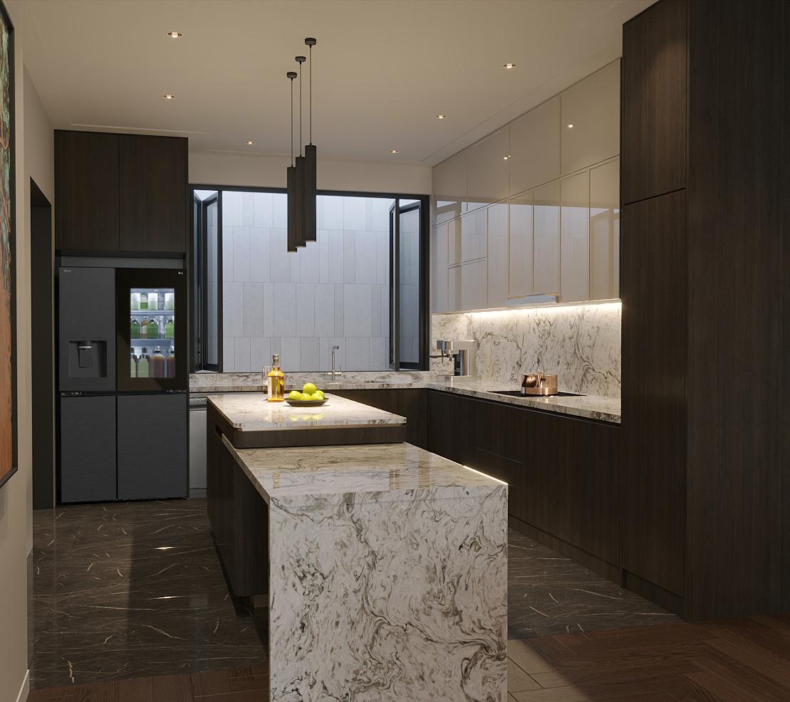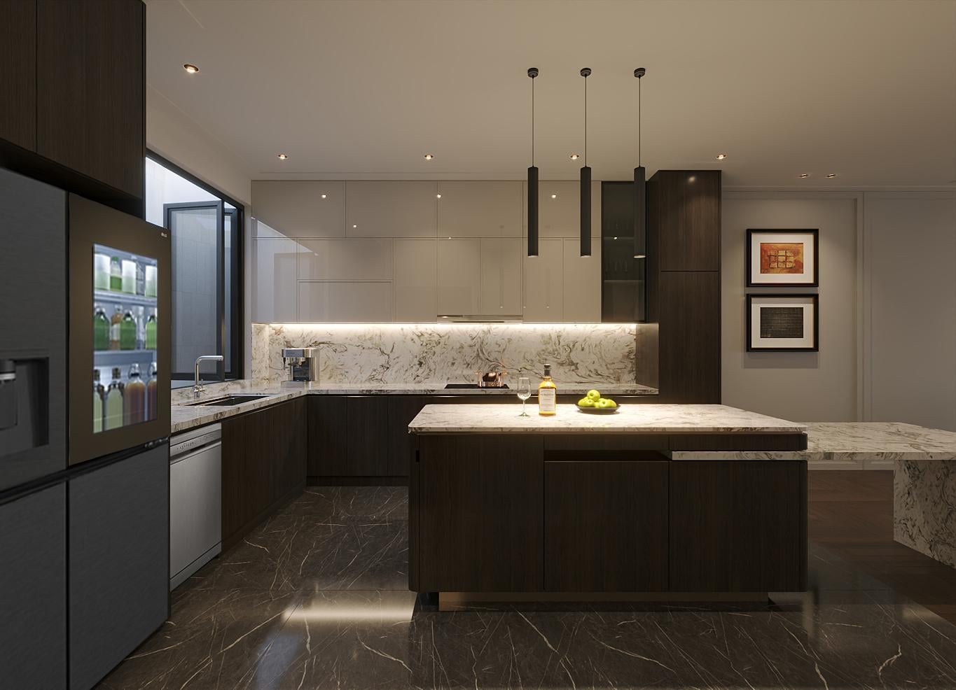 Ở khu vực bếp chính, tủ lạnh LG Instaview Door-in-door màu đen trở thành điểm nhấn hiện đại, vừa nổi bật trên nền đá vân mây sang trọng, vừa tiện lợi với cửa kính gõ nhẹ là sáng, giúp quan sát thực phẩm dễ dàng hơn.