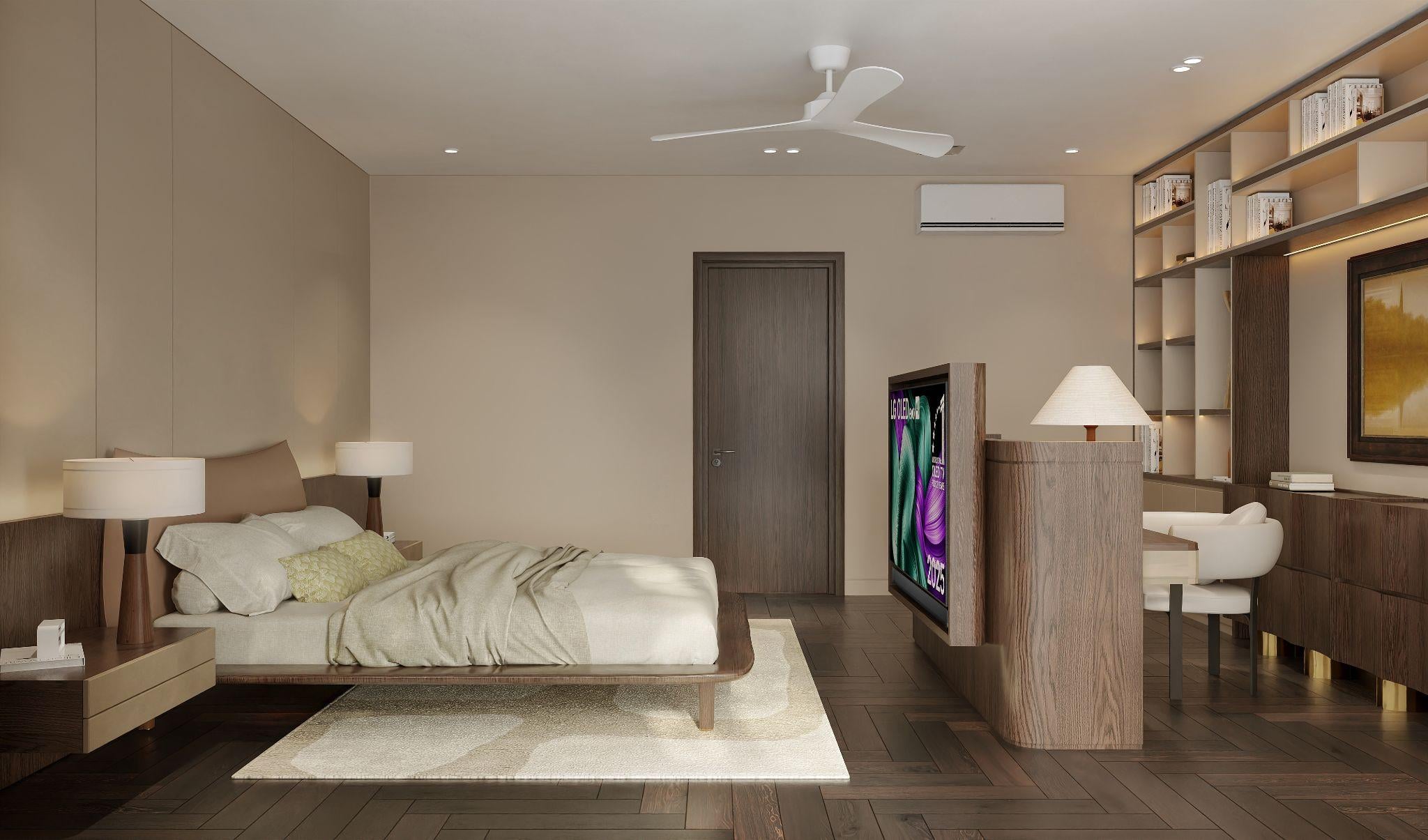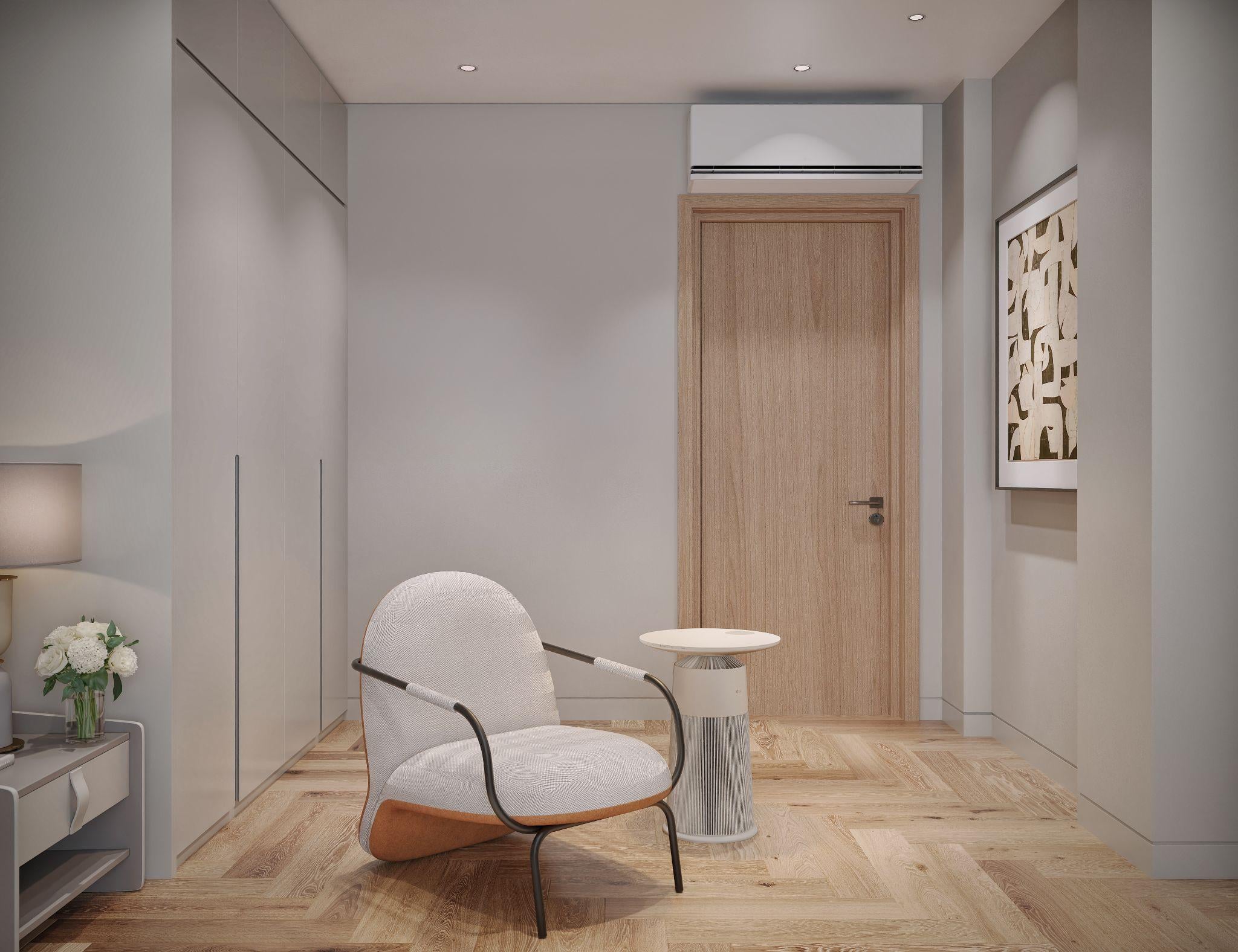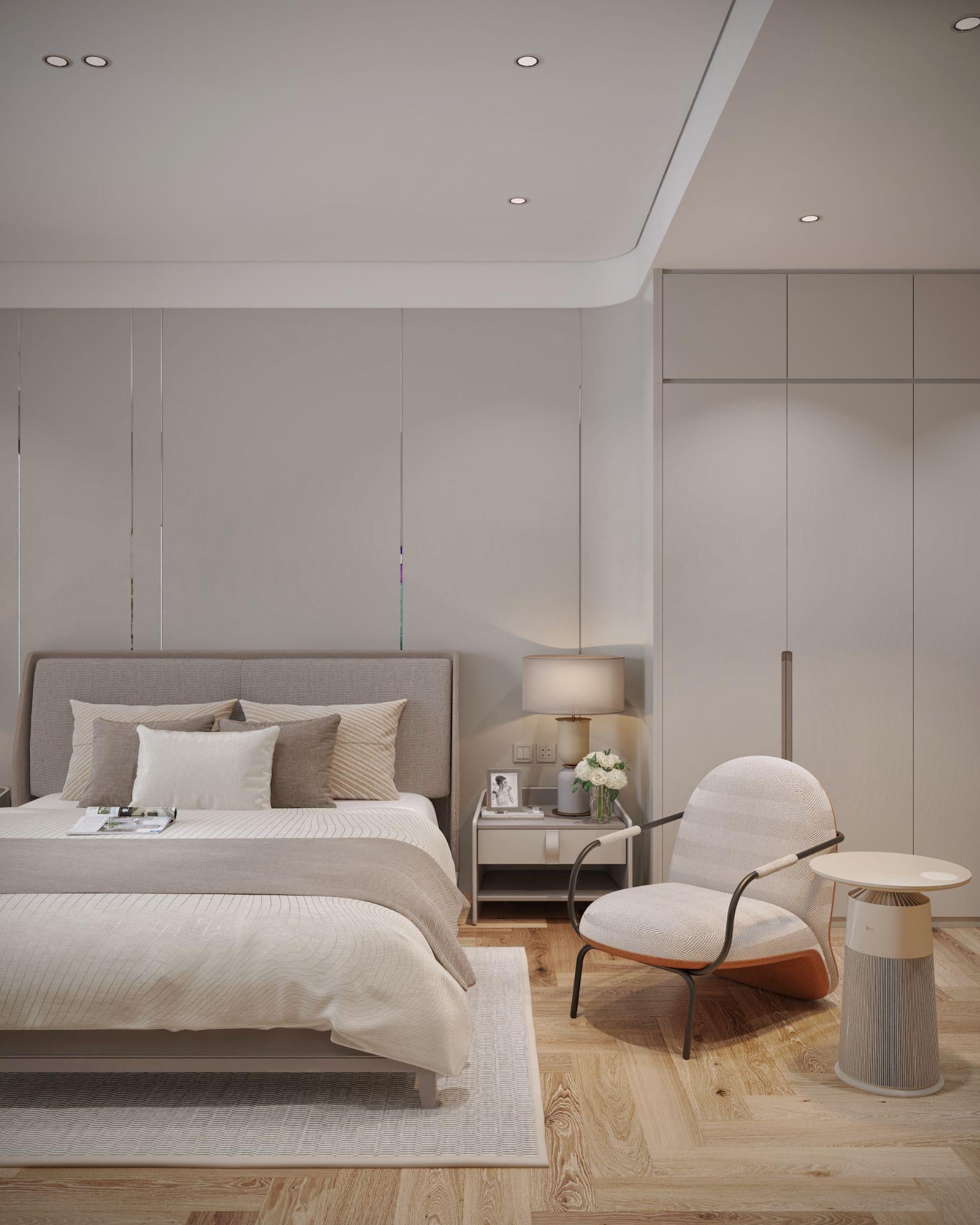Không gian phòng ngủ master và phòng ngủ con đều được trang bị điều hòa LG DUALCOOL Inverter, đảm bảo giấc ngủ dễ chịu nhờ khả năng làm lạnh nhanh, vận hành êm ái. Máy lọc không khí LG PuriCare AeroFurniture màu trắng đóng vai trò như một chiếc bàn đầu giường vừa thẩm mỹ vừa tiện dụng.