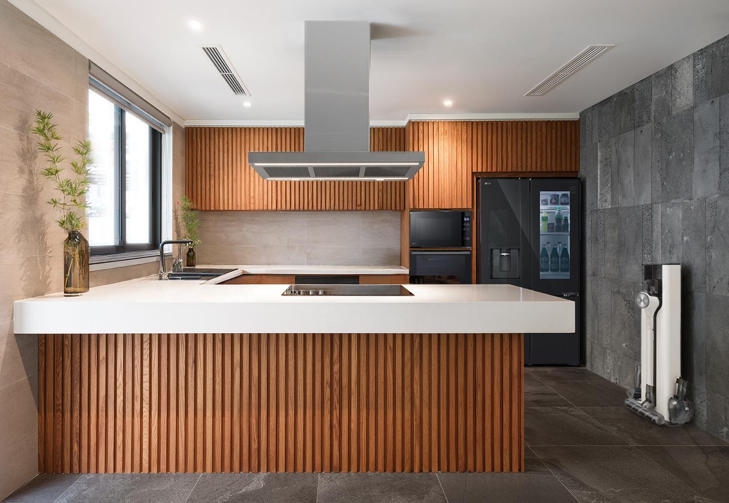 Ở góc tường bếp, máy hút bụi cầm tay LG CordZero với All-in-One Tower A9T-ULTRA được đặt gọn trong trụ sạc – lưu trữ riêng. Đây là một chi tiết nhỏ nhưng cho thấy tư duy sống rất thực tế: với nhà nhiều tầng, sàn gạch và sàn gỗ đan xen, việc có một thiết bị hút bụi luôn trong trạng thái sẵn sàng giúp việc dọn dẹp trở nên nhanh gọn và nhẹ nhàng hơn rất nhiều.